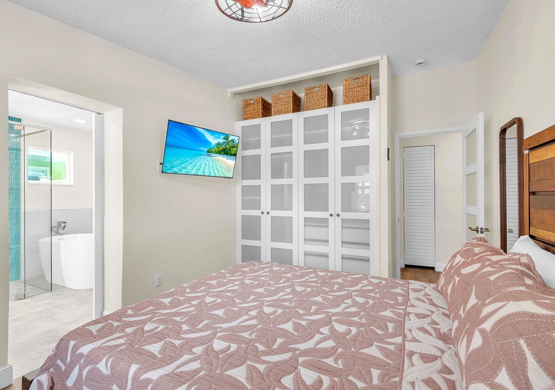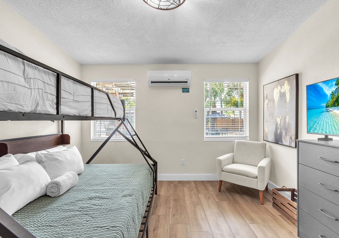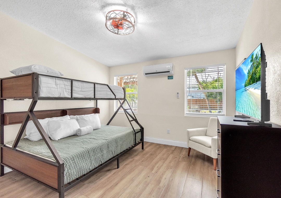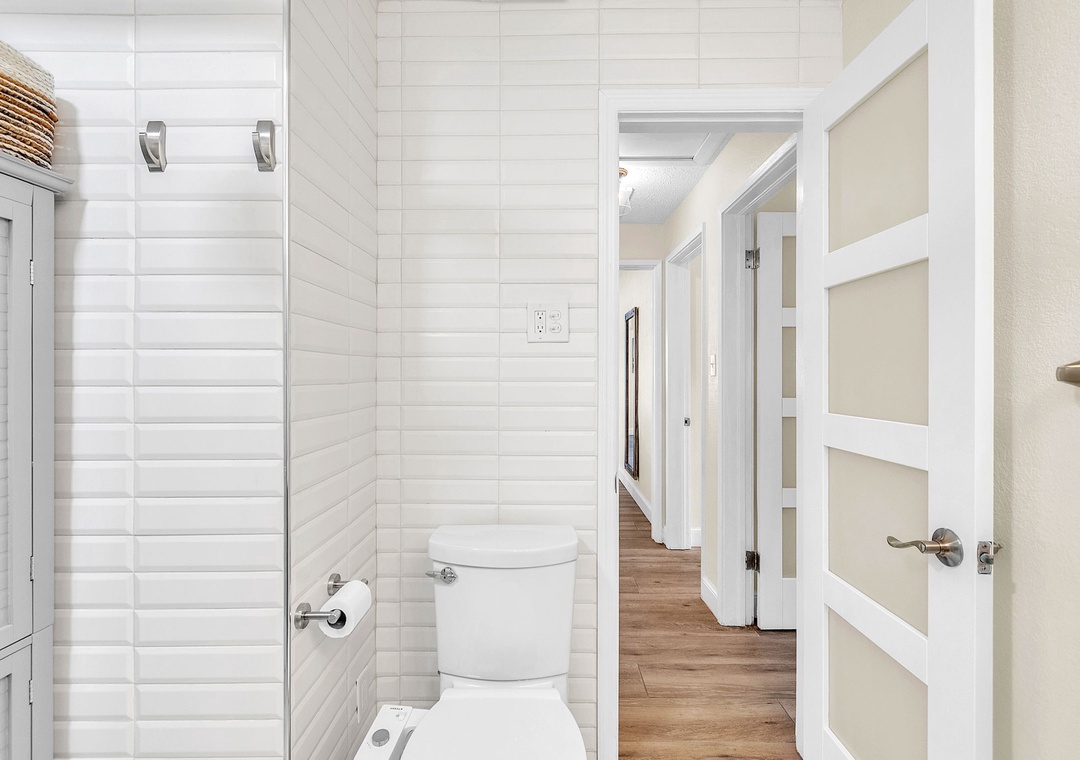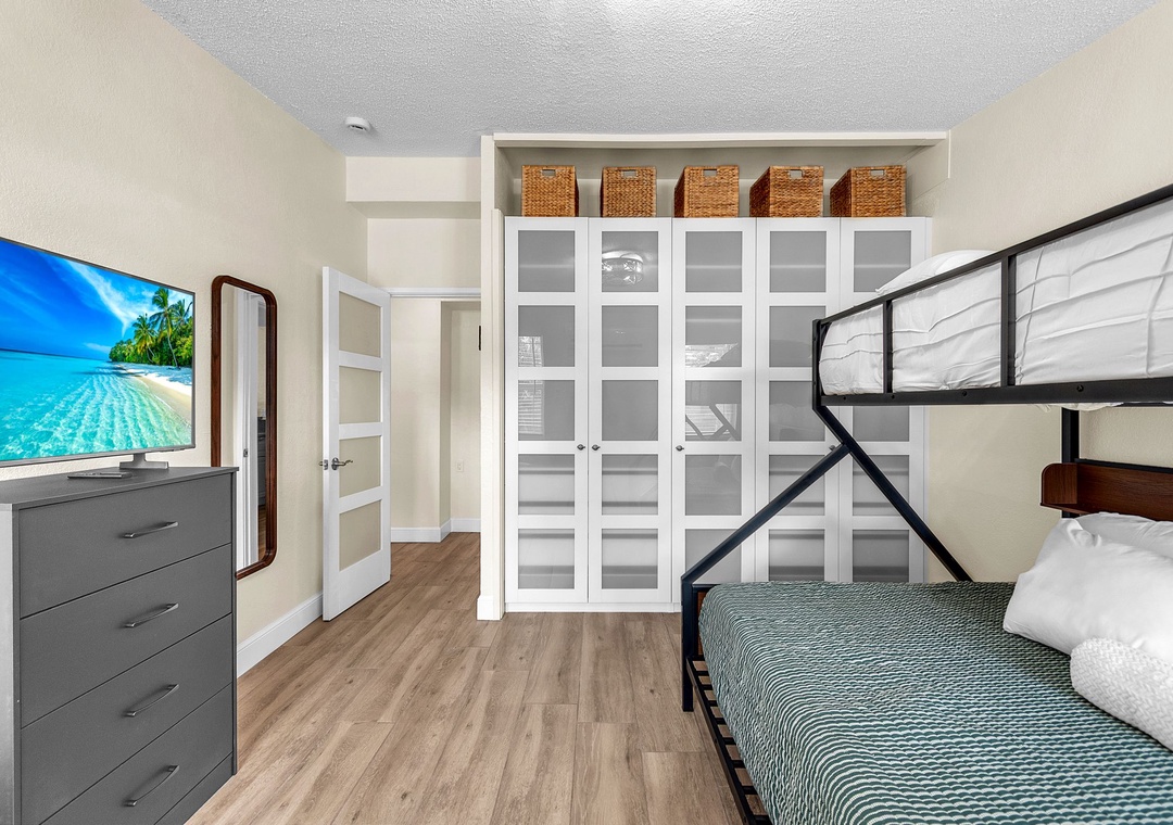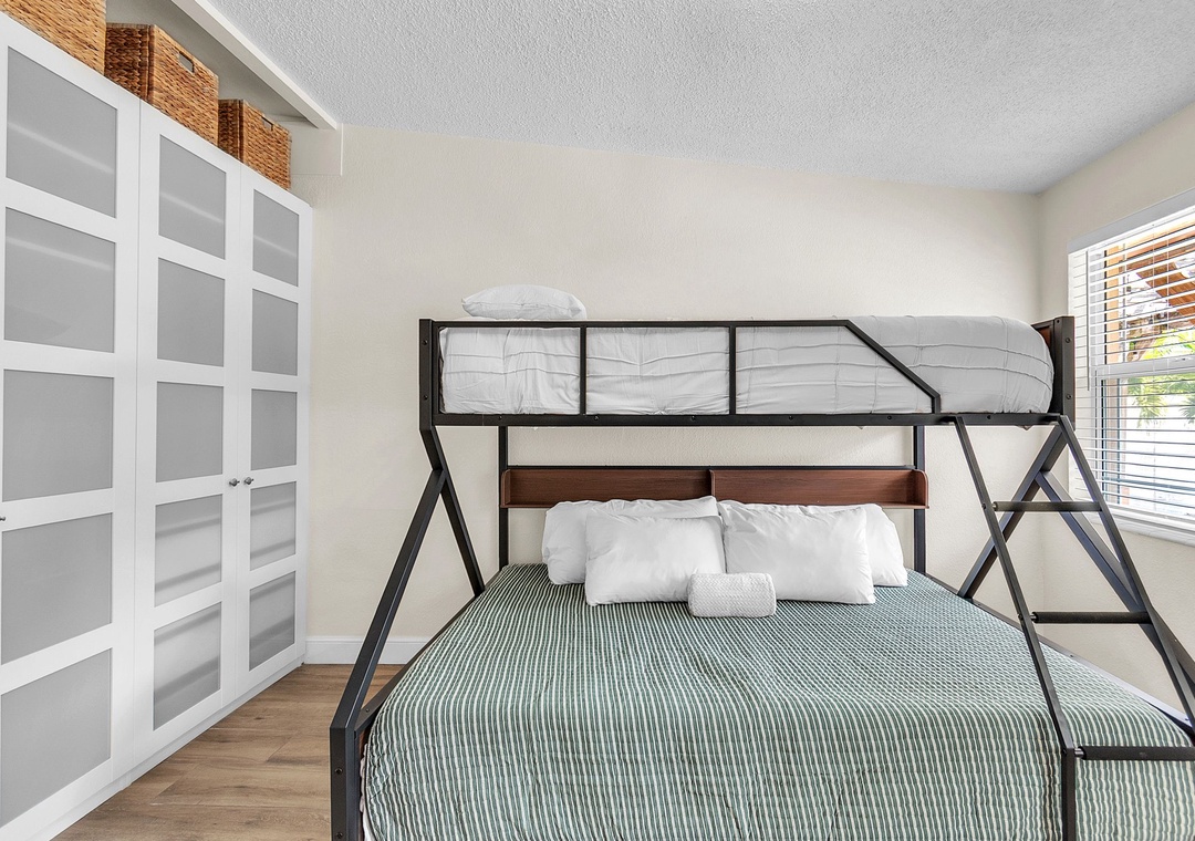 The master bedroom offers a queen bed, TV and a beautifully updated en-suite bathroom featuring a large walk-in shower with stunning tile work and a separate soaking tub—perfect for unwinding after a day at the beach. There is a door in this bathroom that leads to the pool deck. A washer and dryer are also included for your convenience. The guest bedroom includes a twin-over-queen bunk bed and TV, making it great for families or additional guests. The guest bathroom is tastefully updated with a walk-in shower.