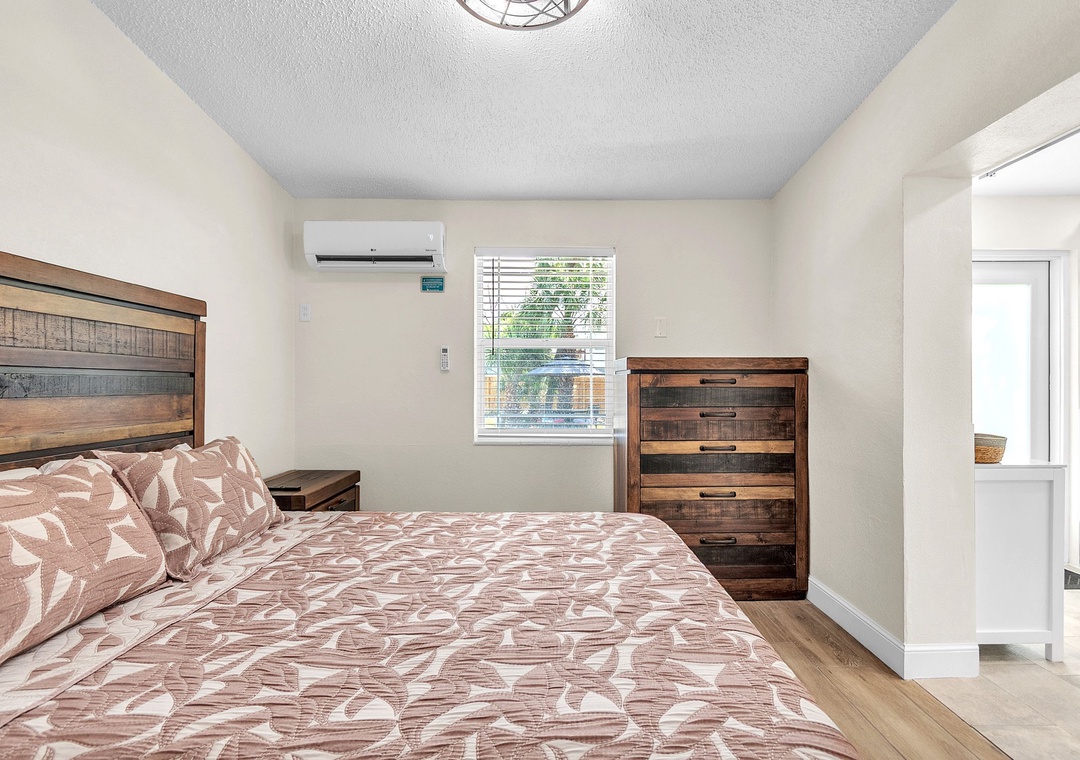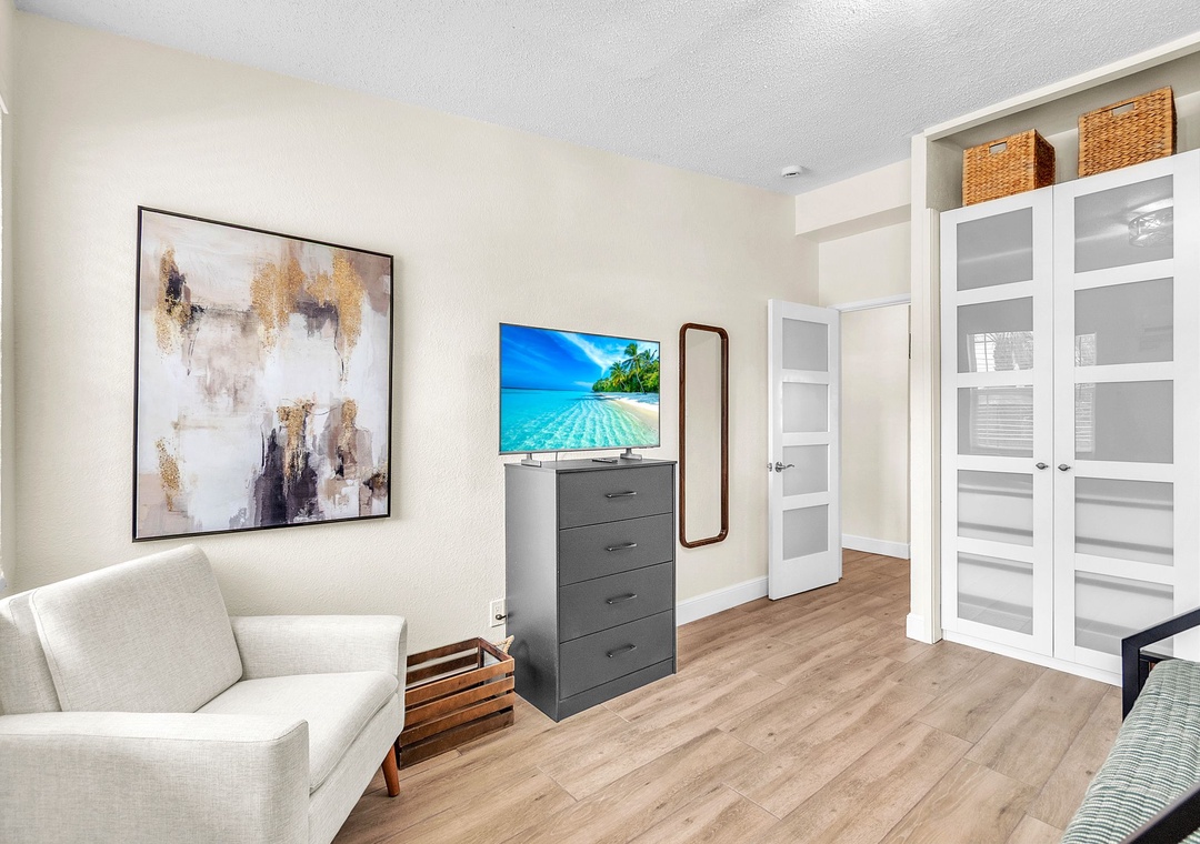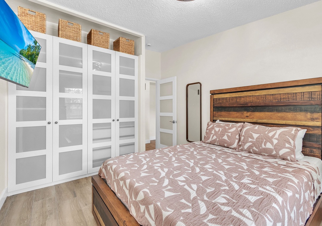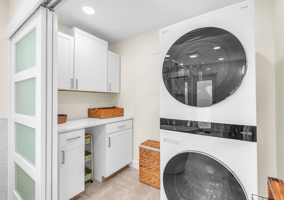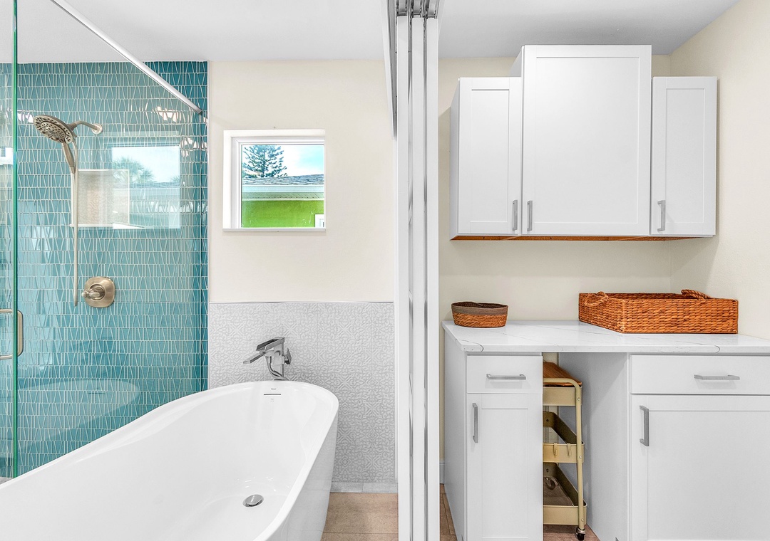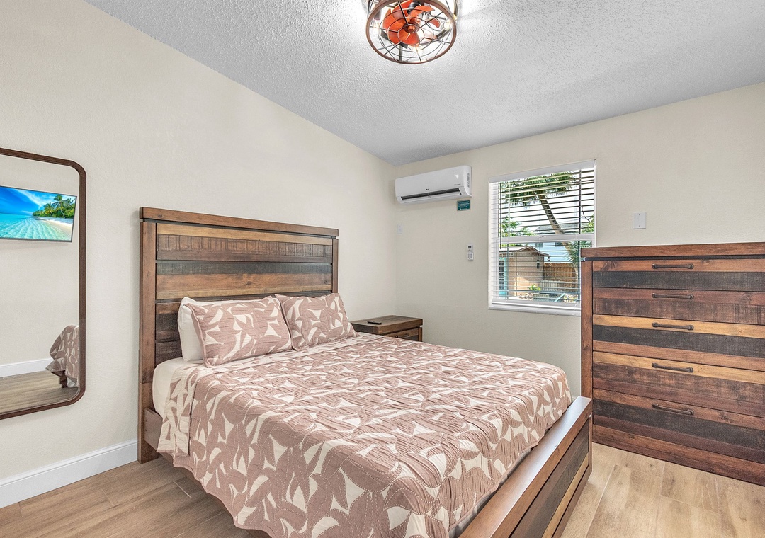The master bedroom offers a queen bed, TV and a beautifully updated en-suite bathroom featuring a large walk-in shower with stunning tile work and a separate soaking tub—perfect for unwinding after a day at the beach. There is a door in this bathroom that leads to the pool deck. A washer and dryer are also included for your convenience. The guest bedroom includes a twin-over-queen bunk bed and TV, making it great for families or additional guests. The guest bathroom is tastefully updated with a walk-in shower.