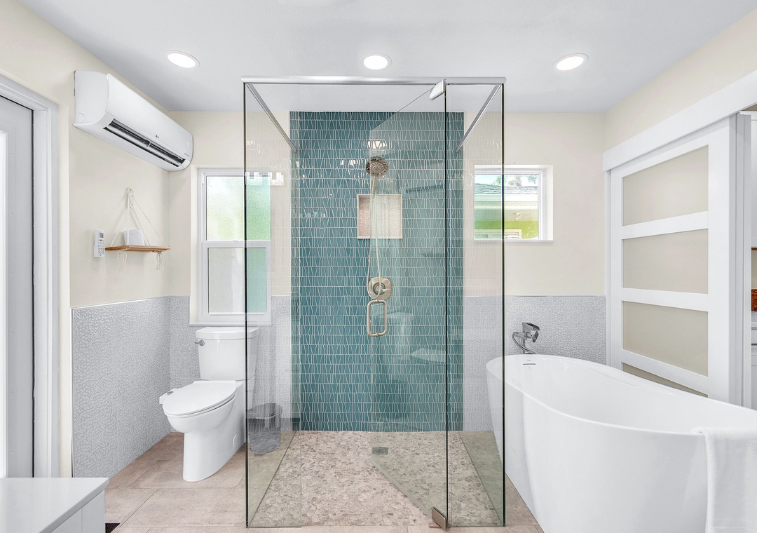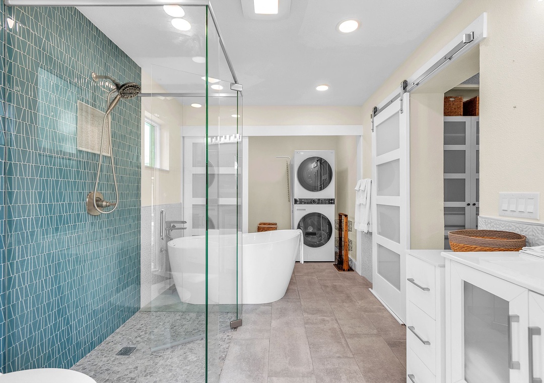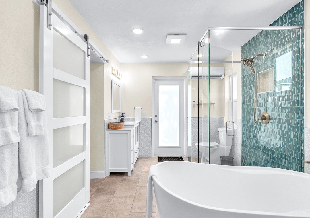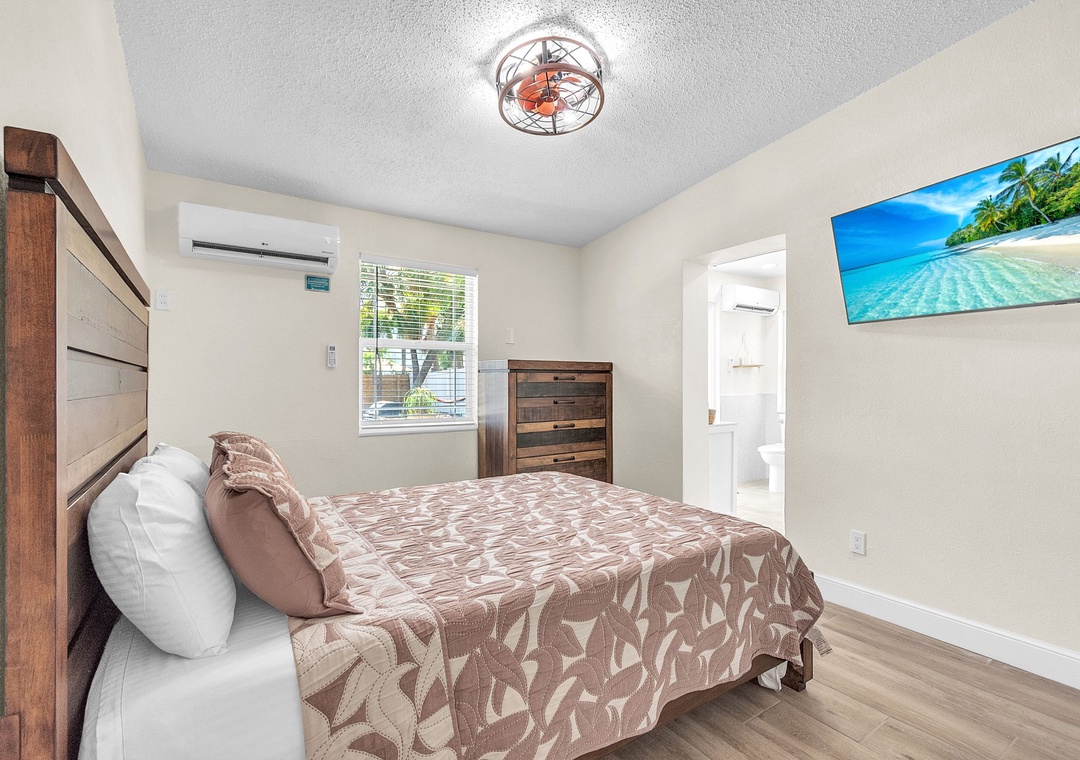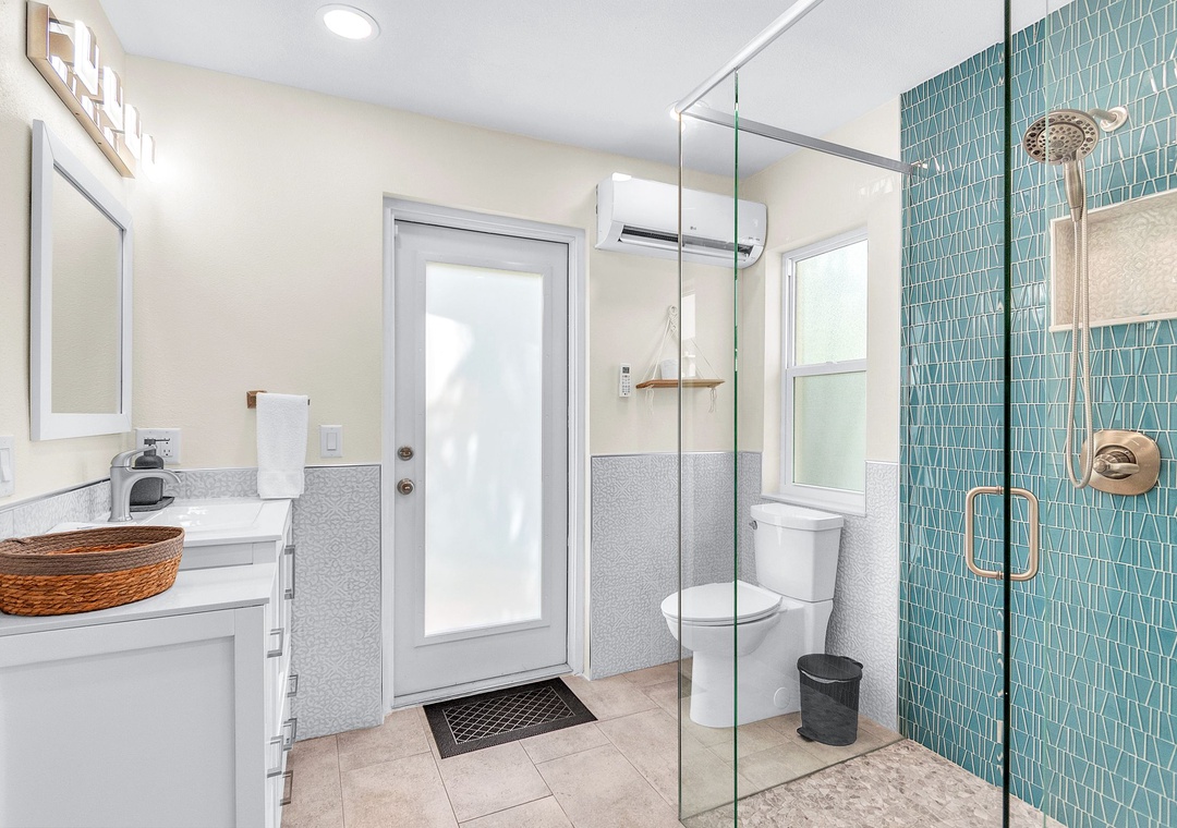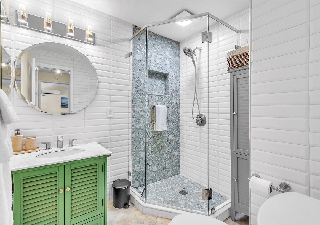 The master bedroom offers a queen bed, TV and a beautifully updated en-suite bathroom featuring a large walk-in shower with stunning tile work and a separate soaking tub—perfect for unwinding after a day at the beach. There is a door in this bathroom that leads to the pool deck. A washer and dryer are also included for your convenience. The guest bedroom includes a twin-over-queen bunk bed and TV, making it great for families or additional guests. The guest bathroom is tastefully updated with a walk-in shower.