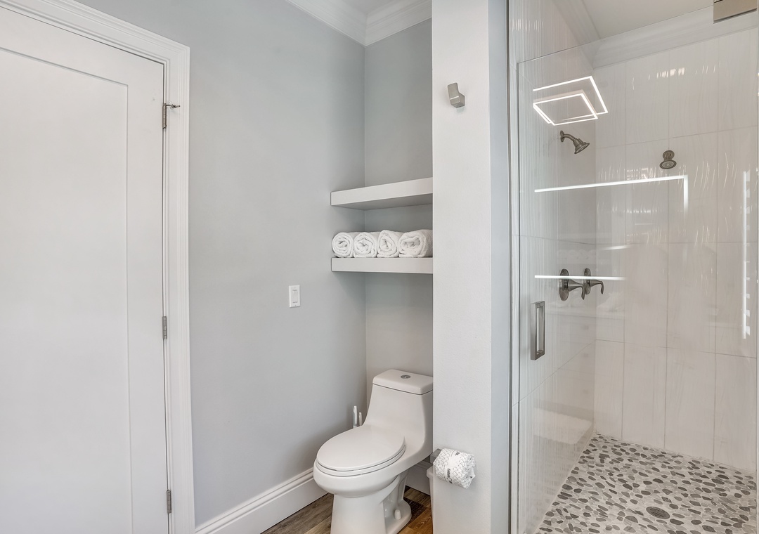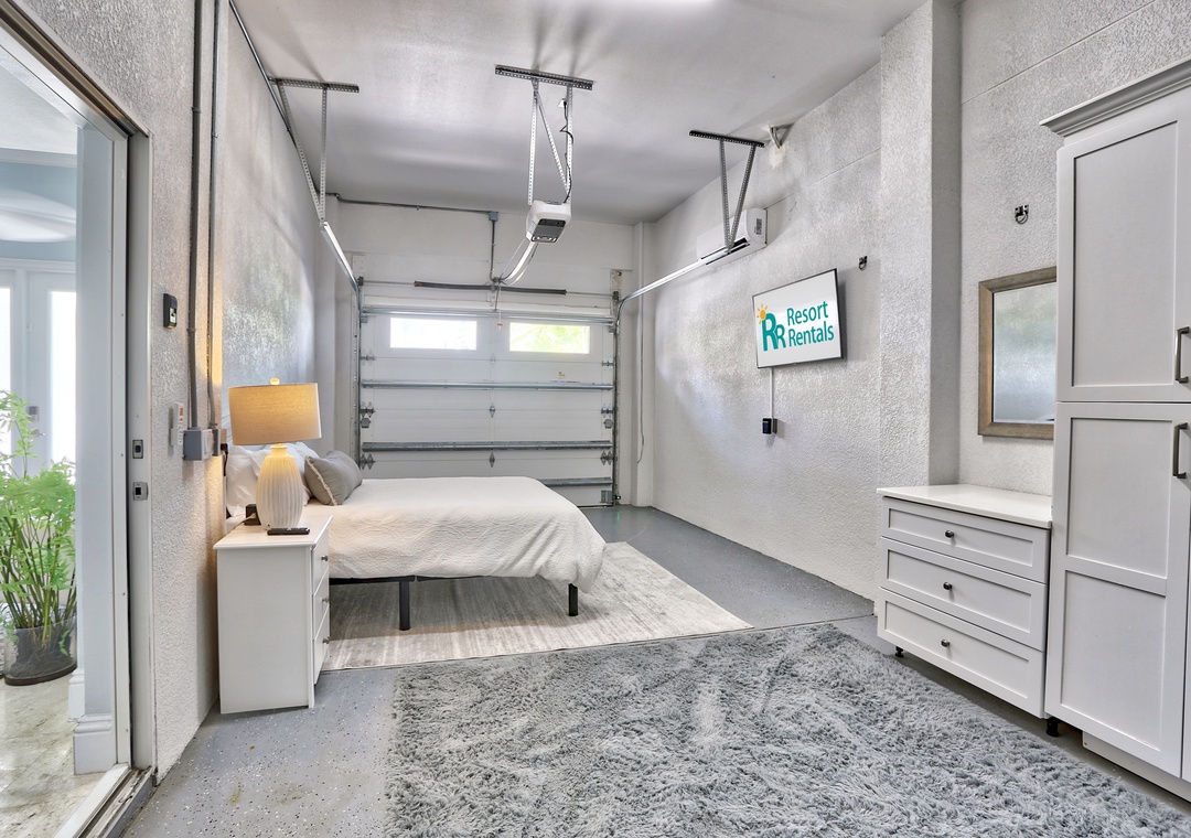 After a long day of adventure, enjoy the second floor hot tub with a view creating a magical relaxing atmosphere during your one of a kind vacation experience. Access deck from kitchen area. Towels for Spa are provided. When you are ready to retire for the night, head up to the next floor where you’ll find the comfortable king bed in the main bedroom as well as an attached ensuite bathroom that includes dual sinks and a luxurious walk In shower. Also on this level is the second bedroom which offers a cozy queen size bed as well as an attached full bathroom with an all tile walk in shower. Across the hall is a third bedroom that includes a queen over queen bunk bed. For additional sleeping arrangements, you'll find the 4th bedroom (converted garage) outfitted with a queen size bed.