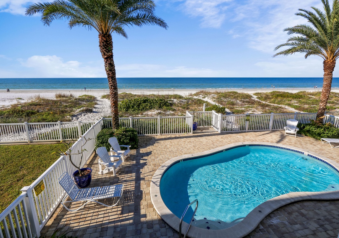 • Onsite heated pool; direct beach access.