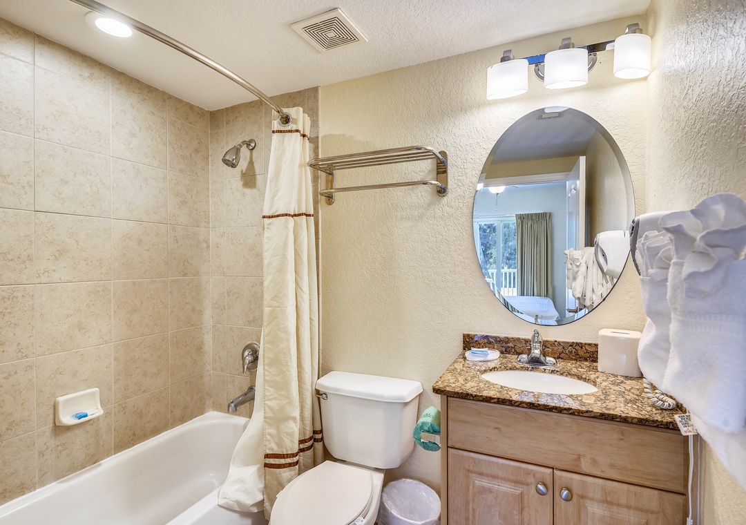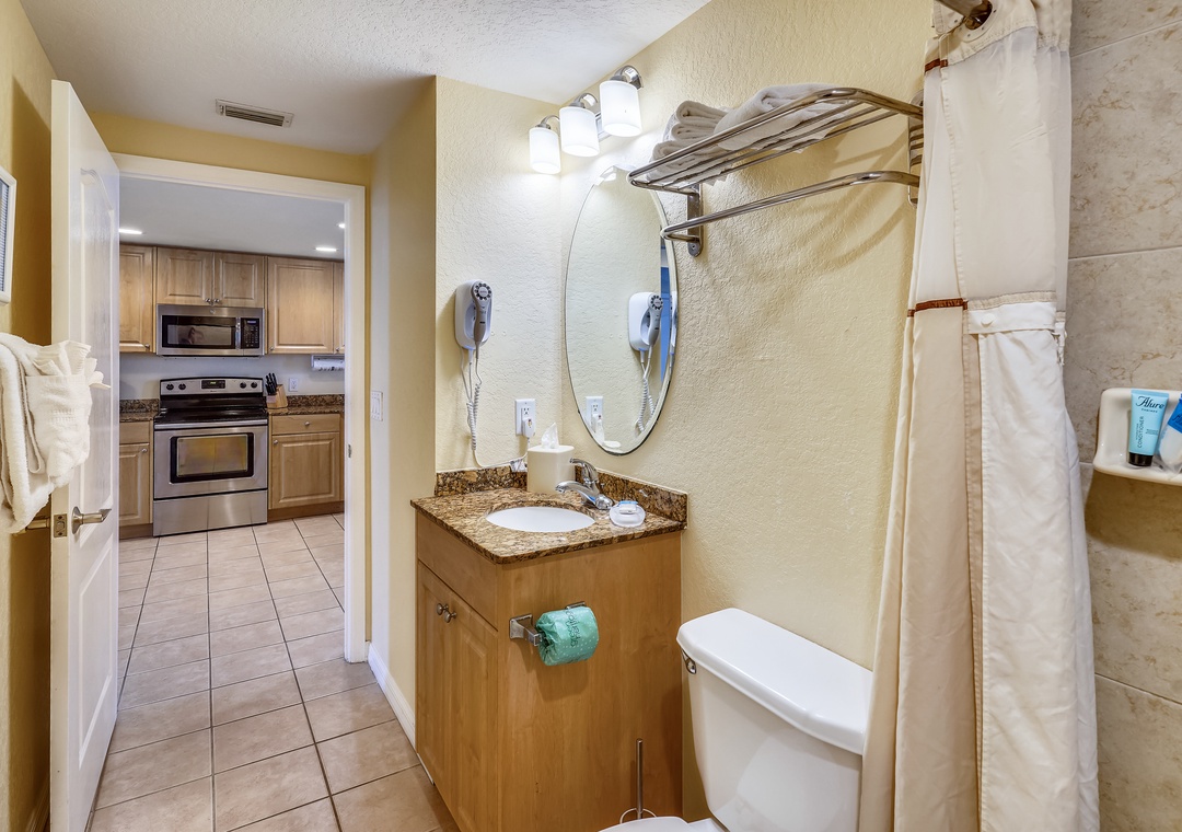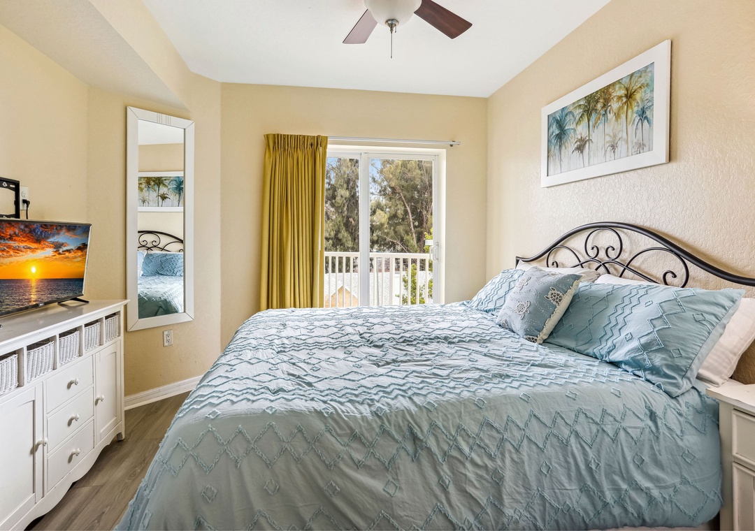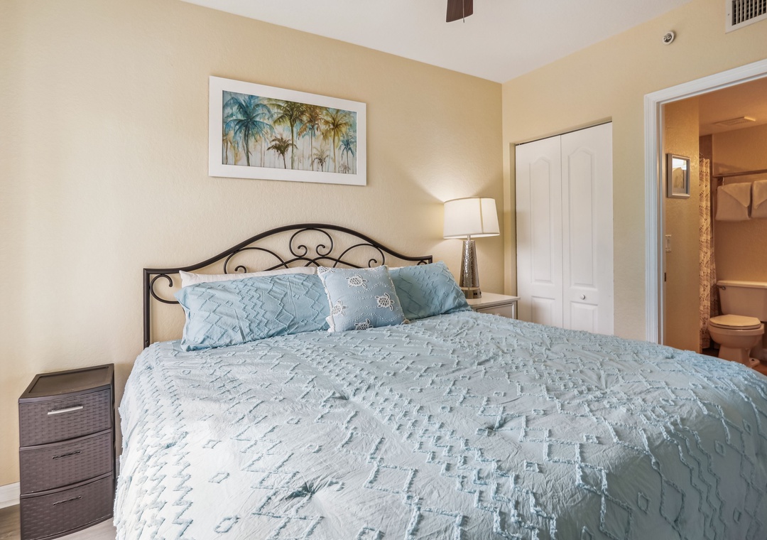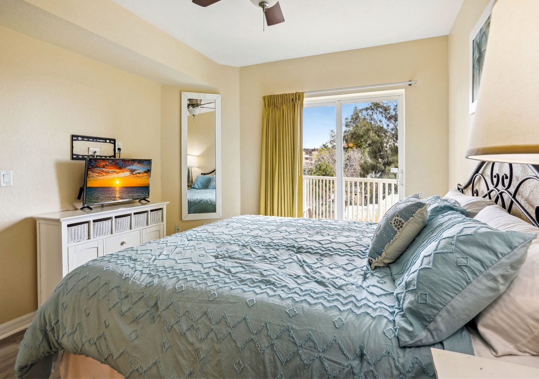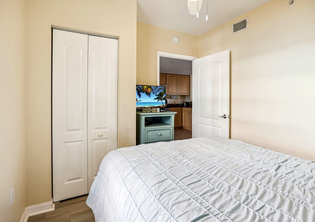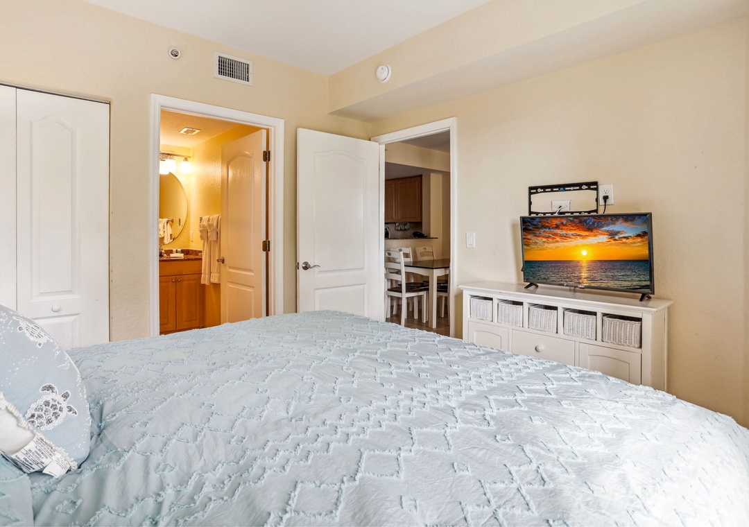 The master bedroom boasts a king-sized bed, TV, balcony access, and an en-suite bathroom. The guest bedroom includes a full-sized bed and TV, and there's a sofa sleeper in the living room for additional guests. For your convenience, the unit also includes a private washer/dryer. Additional bonuses here are free Wifi, on-site parking and access to resort style amenities.