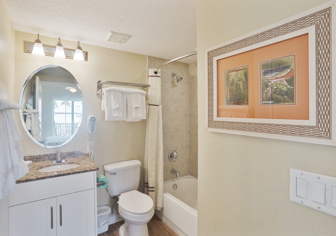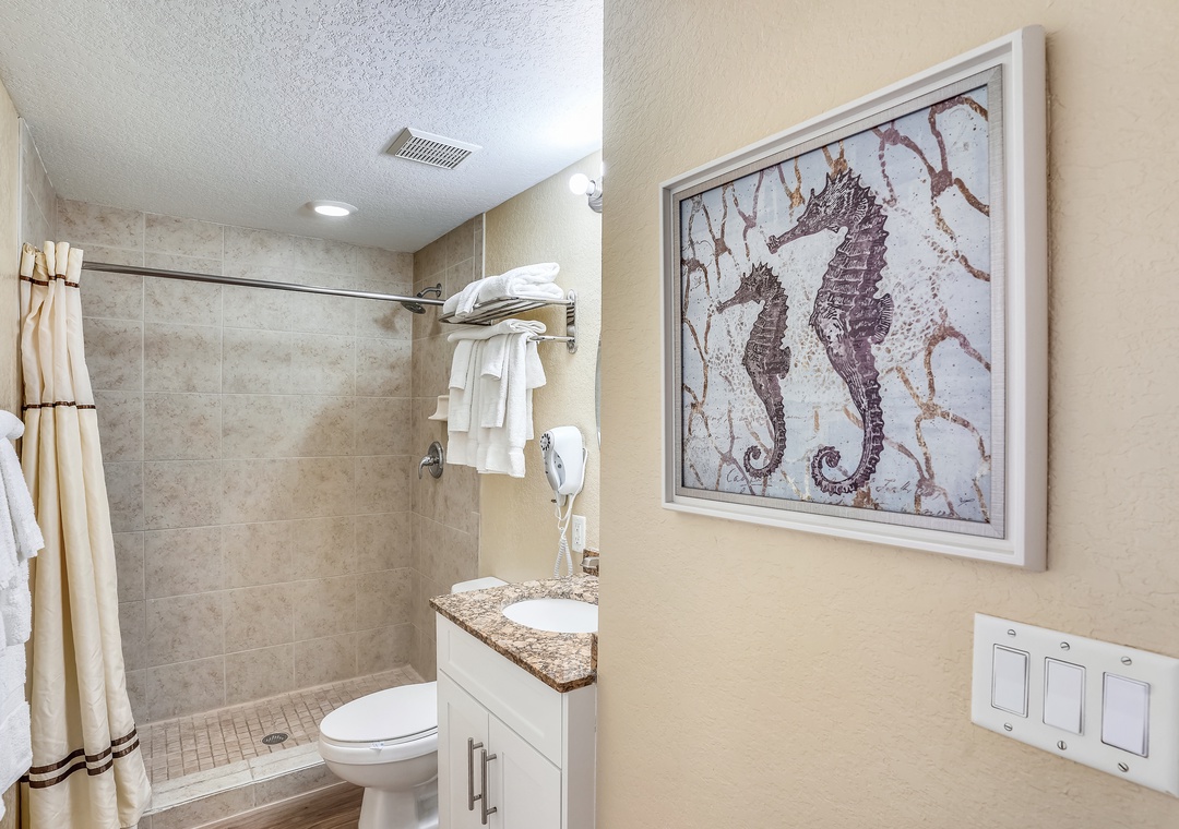 You will enjoy rest and relaxation from the gulf-front main suite which is furnished with a king size bed and beachfront balcony access. The main bath includes a tub/shower combo. The second bedroom and bath is just as impressive and features one queen size bed, a spacious bathroom with a large walk in shower.