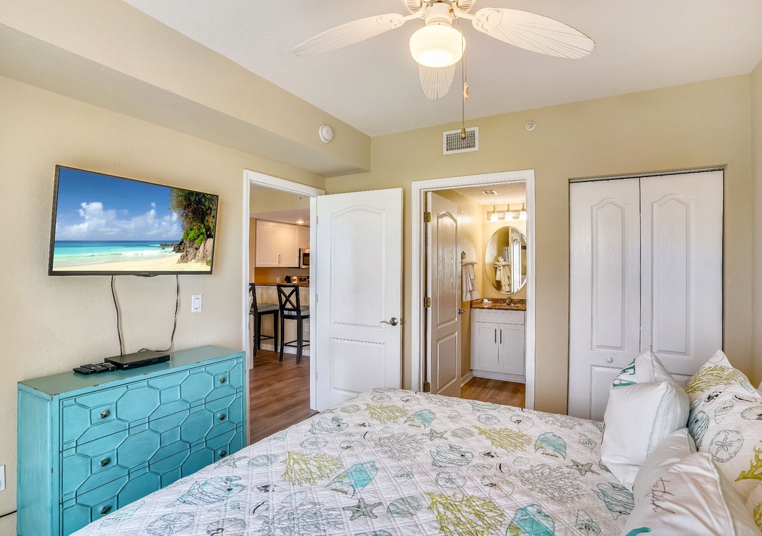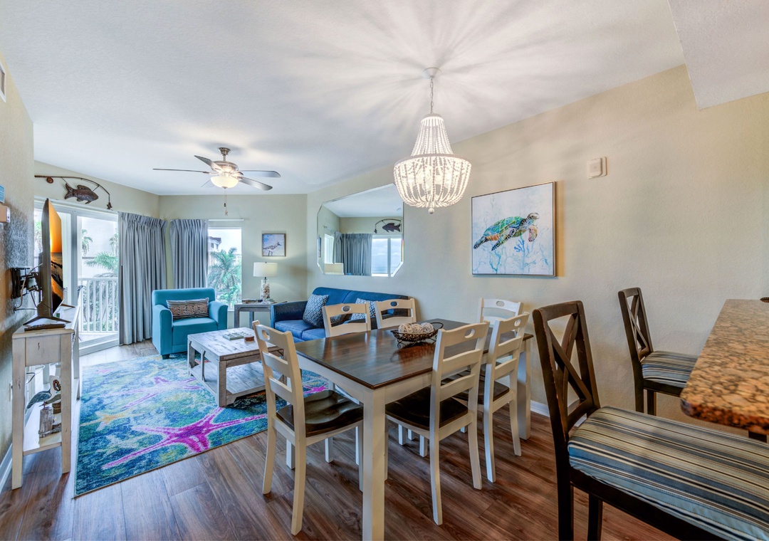 The unit, located on the 4th floor, is newly remodeled and furnished. This two bedroom/two bath unit features a spacious beachfront balcony with endless beach views. The unit features new furnishings and décor throughout. Enjoy lounging with family for movie night in the living area furnished with a sleeper sofa, complete with expansive views of the Gulf of Mexico. The sliding glass doors open to a covered balcony, where you can sit and enjoy the beauty of the Gulf of Mexico without leaving the comfort of your condo. The fully equipped kitchen will inspire your inner gourmet chef. It features granite countertops and stainless steel appliances plus all the utensils and cookware needed to prepare any meal. The dining room seats 6 at the table with seating for 2 at the breakfast bar.