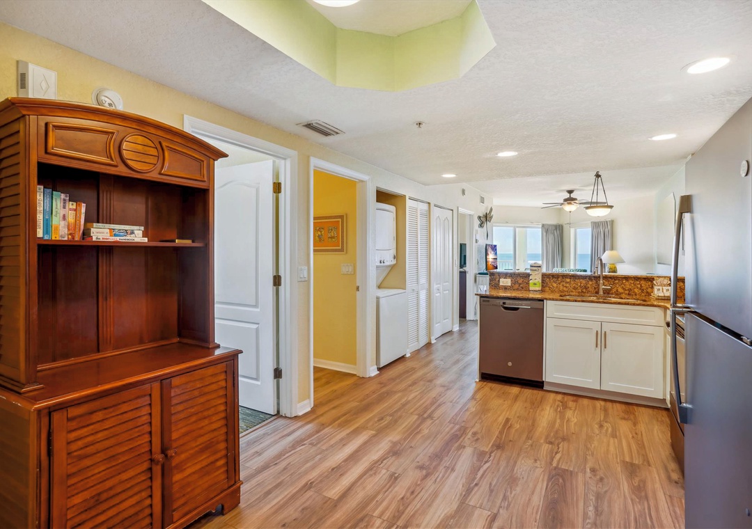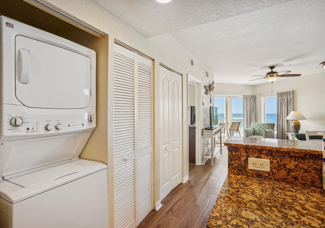This fifth-floor beach retreat comfortably sleeps six. The main bedroom has a king bed, attached is a full-size bathroom with a tub/shower combo. The guest bedroom has a queen size bed. The guest bathroom, down the hall, includes a walk-in shower. For additional sleeping arrangements, this unit also provides a sleeper sofa in the living room. The unit includes a full-size washer and dryer for your convenience.