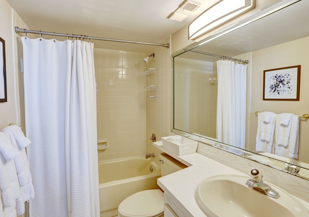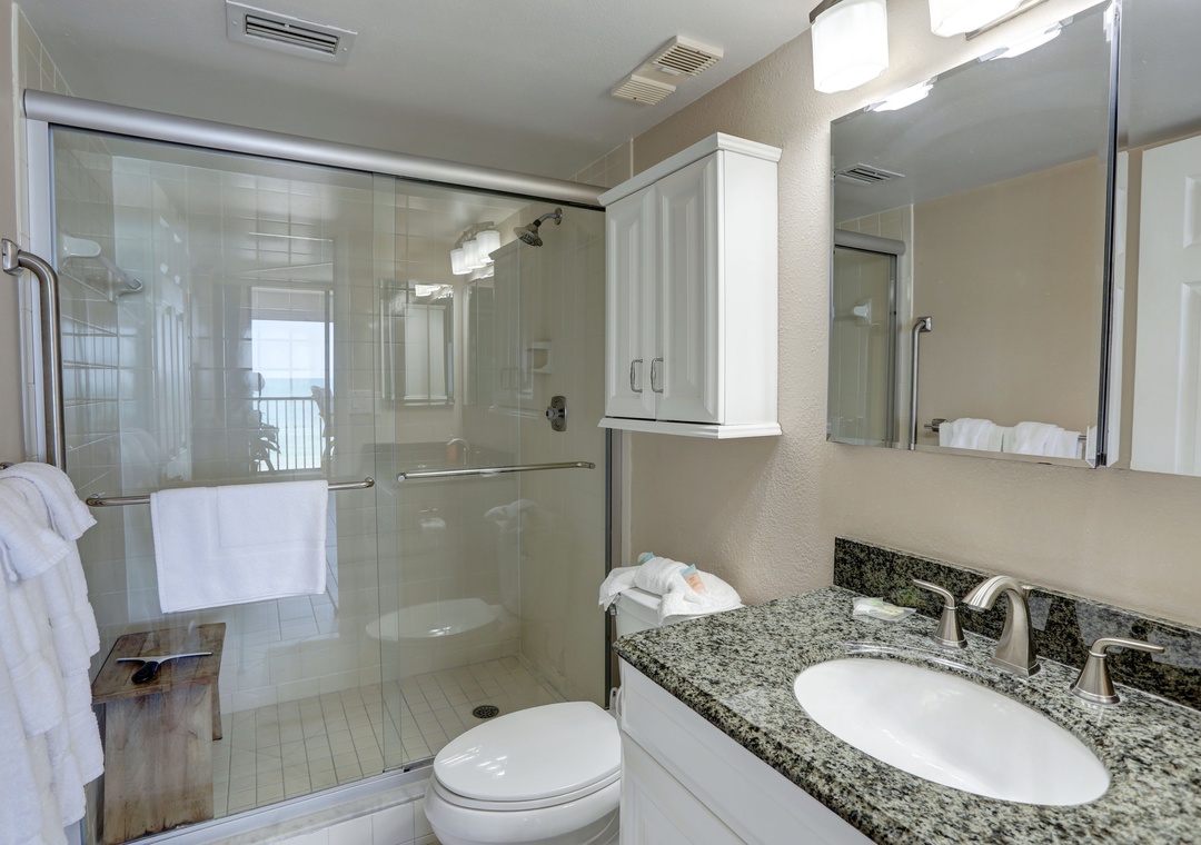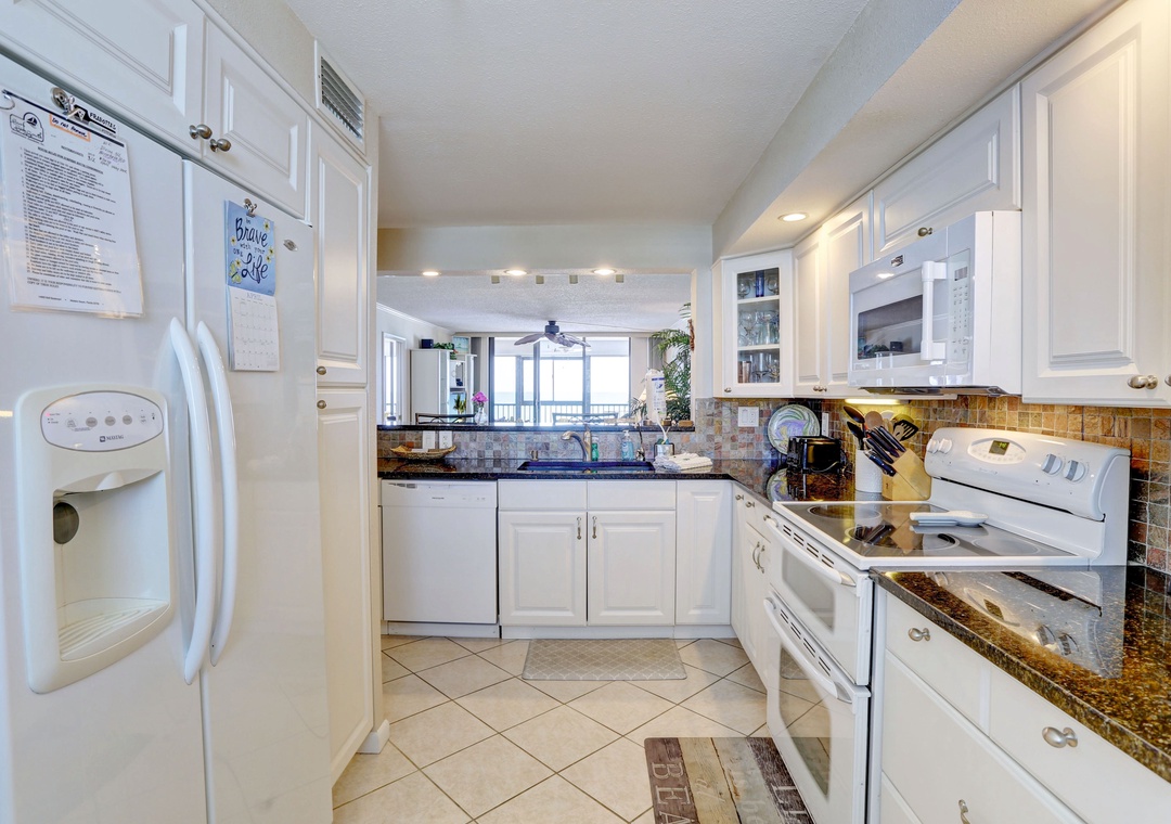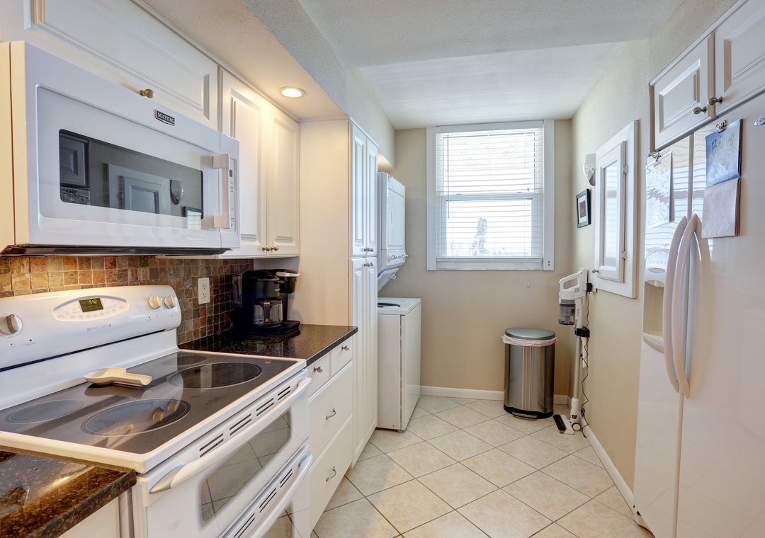 The fully stocked kitchen provides everything you need to whip up delicious meals, from gourmet dinners to beachside snacks. Gather around the dining table, which comfortably seats four, with additional seating for two at the breakfast bar. After a day of adventure, retreat to the impeccably appointed bedrooms, both featuring plush king-sized beds, ceiling fans, and flat-screen TVs. The primary bedroom offers direct balcony access for uninterrupted Gulf views. Refresh in the primary bathroom's walk-in shower, while the second bathroom offers a convenient shower/tub combo. With its prime location, exceptional amenities, and breathtaking views, Surfside South 312 promises a memorable vacation experience for all guests.