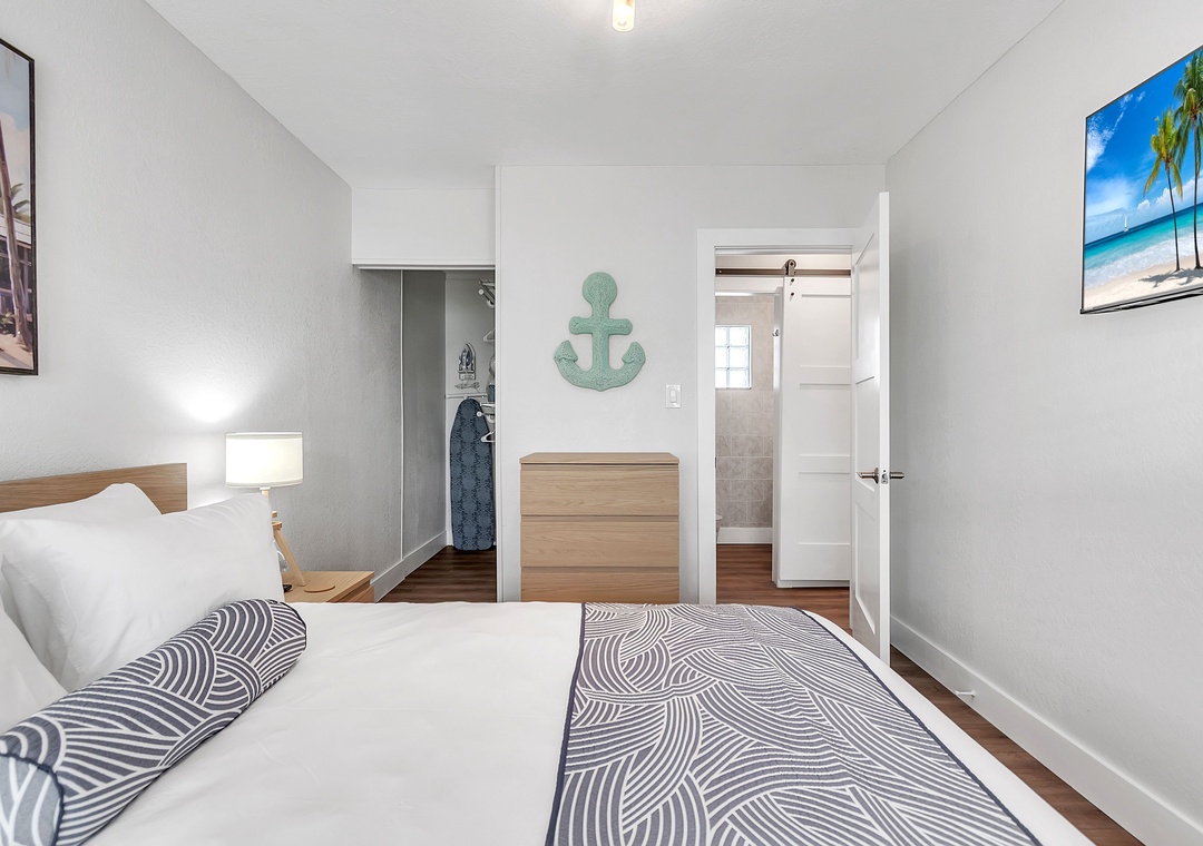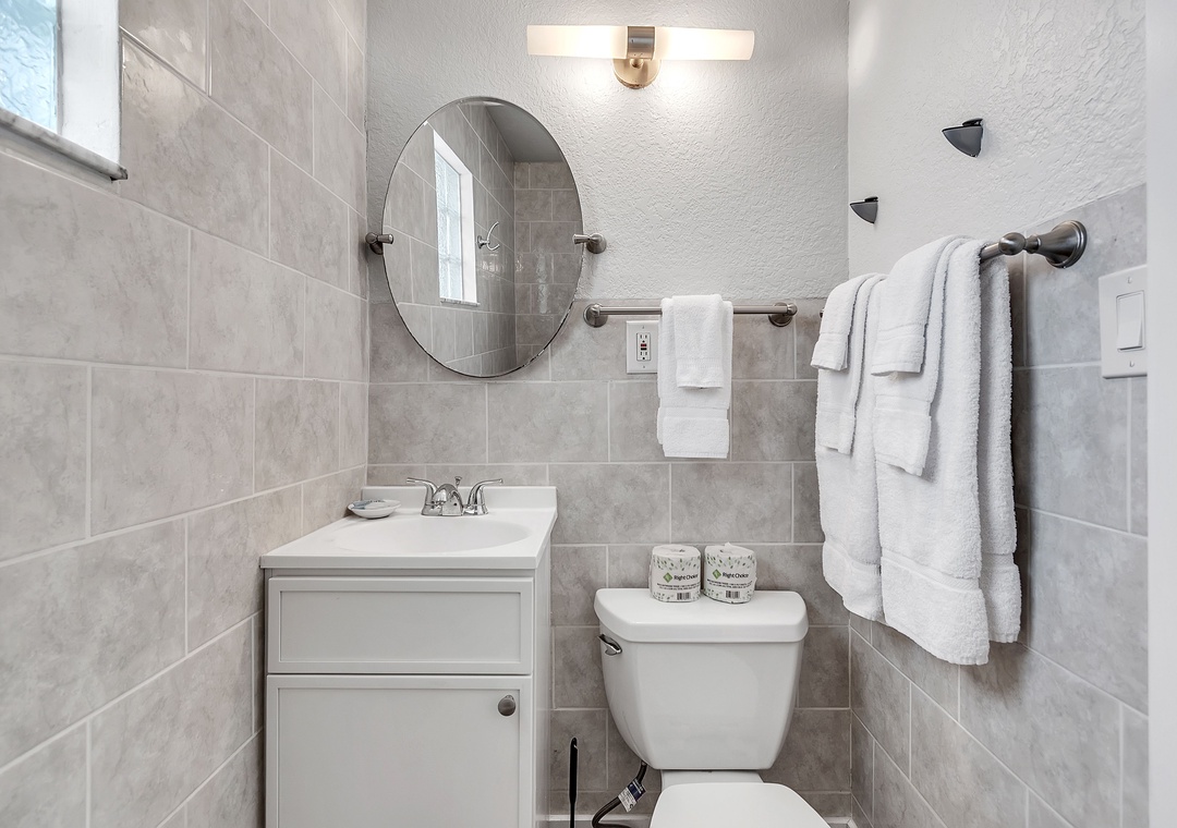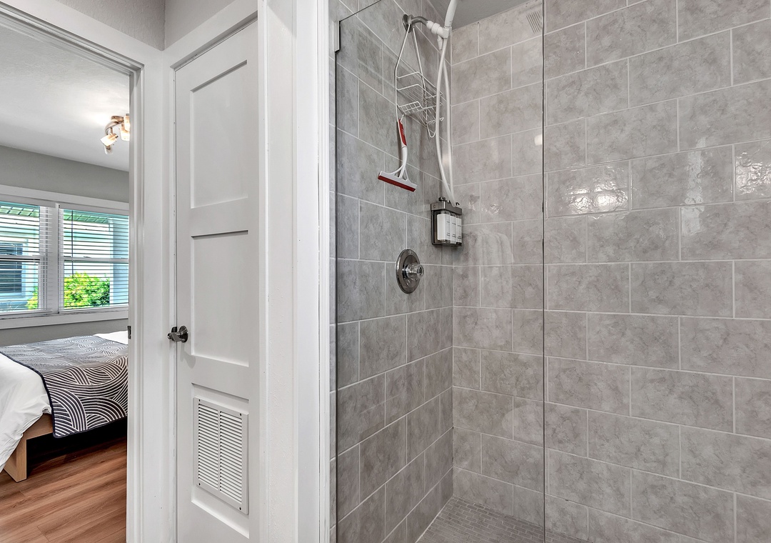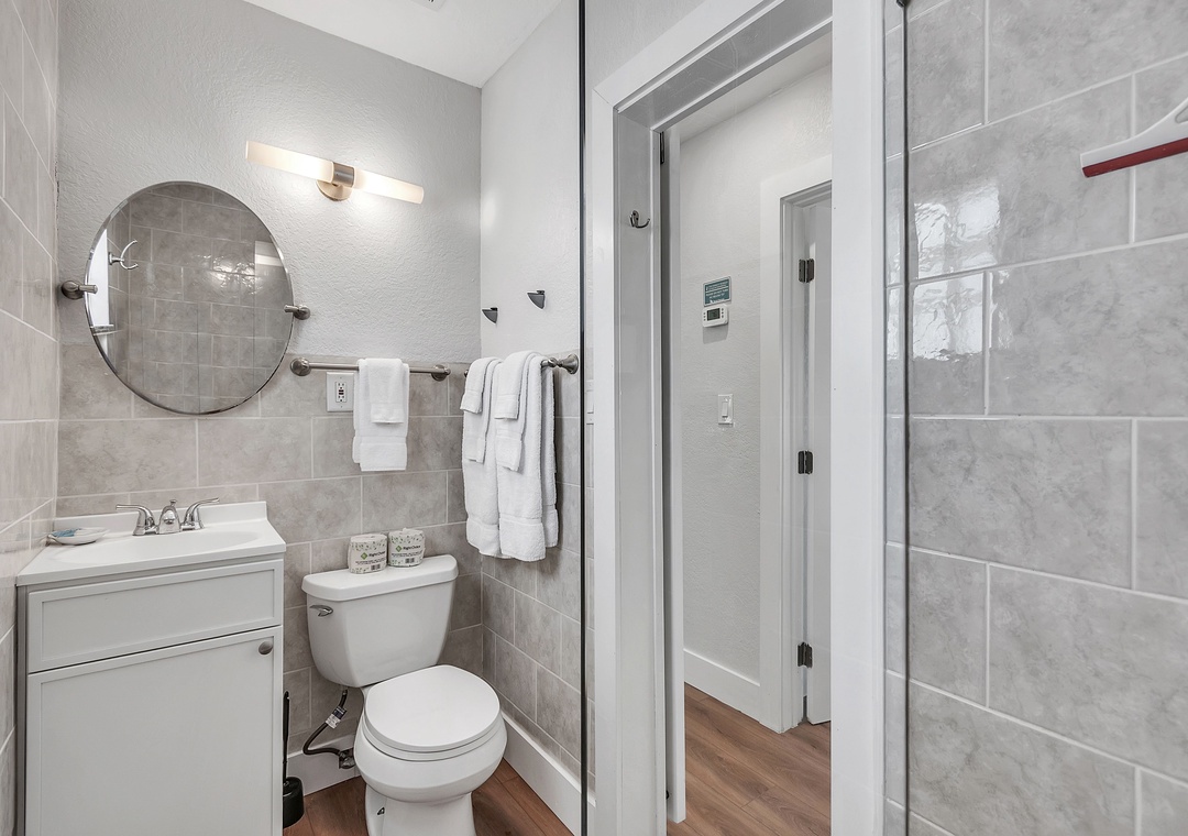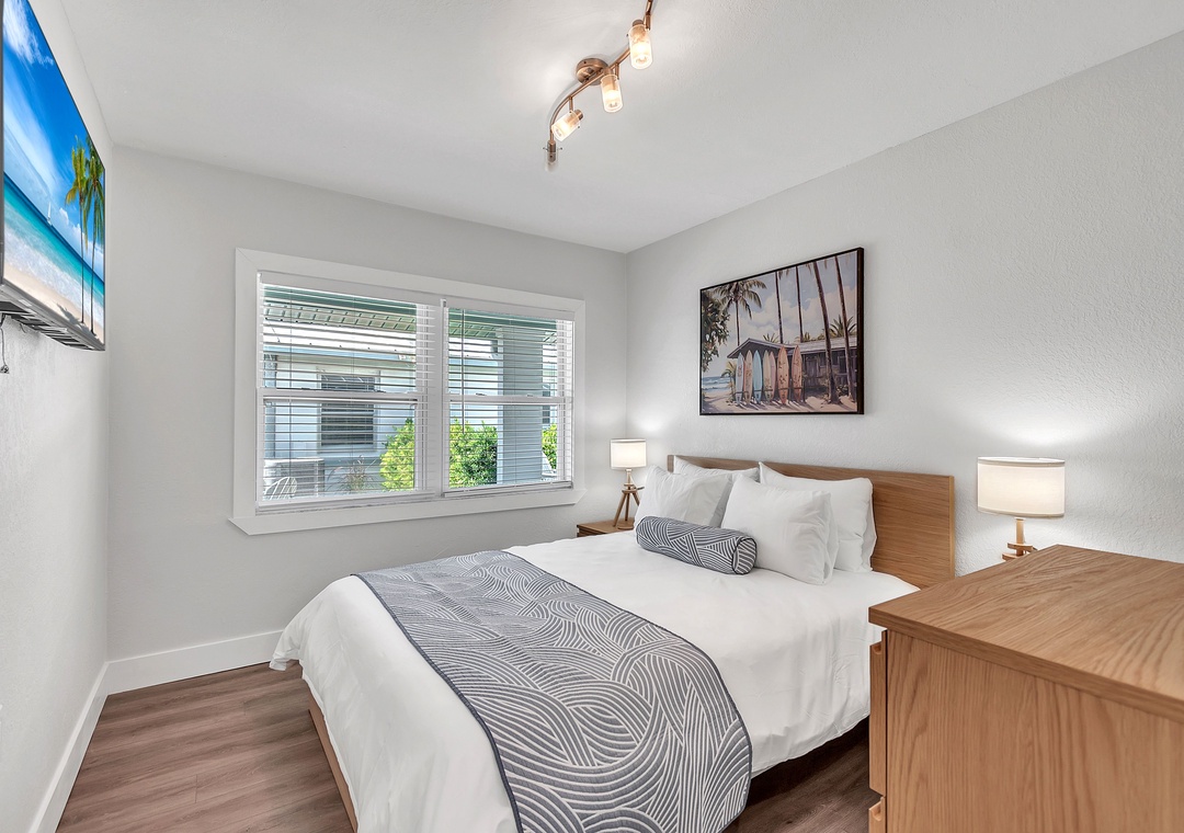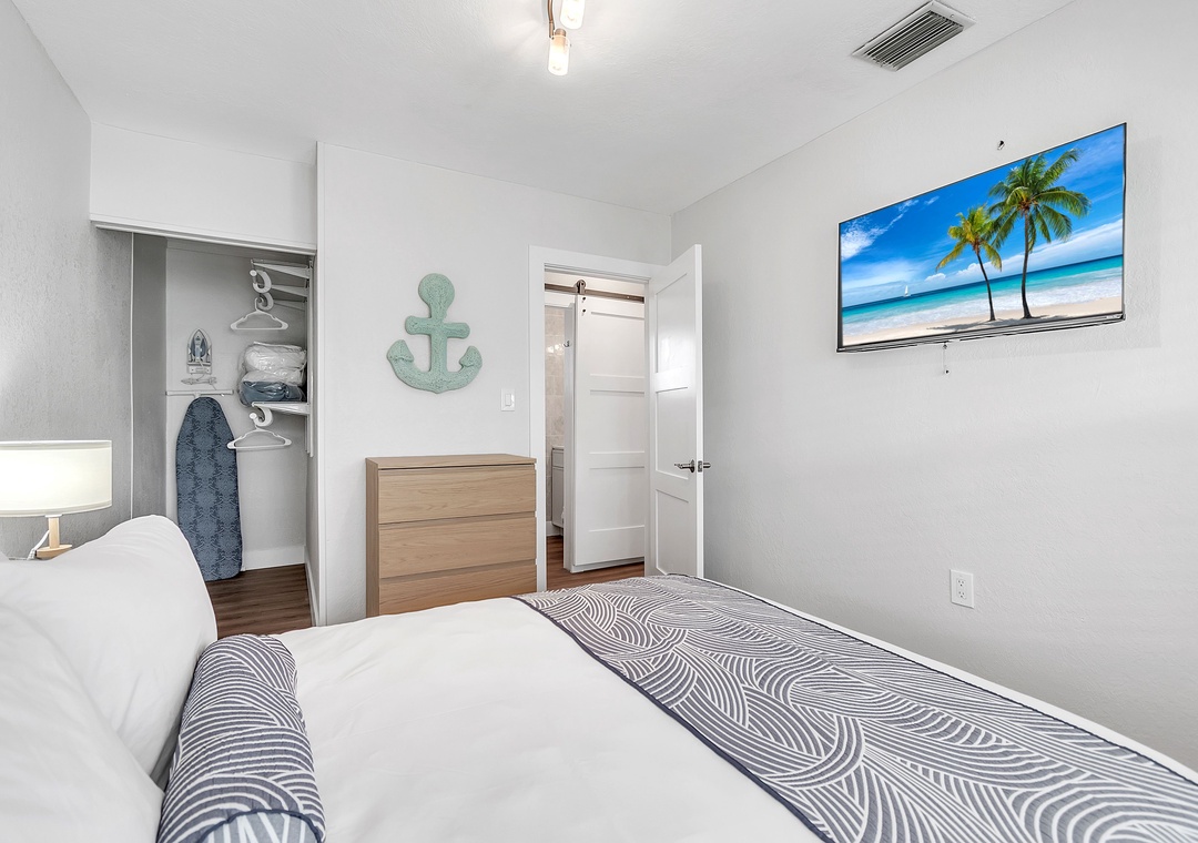 The master bedroom includes a queen bed, TV, and plenty of closet space. The guest bedroom has a twin bed and its own TV—ideal for kids or solo travelers. The bathroom is bright and roomy with a roomy, updated shower.