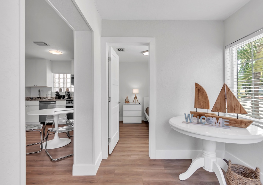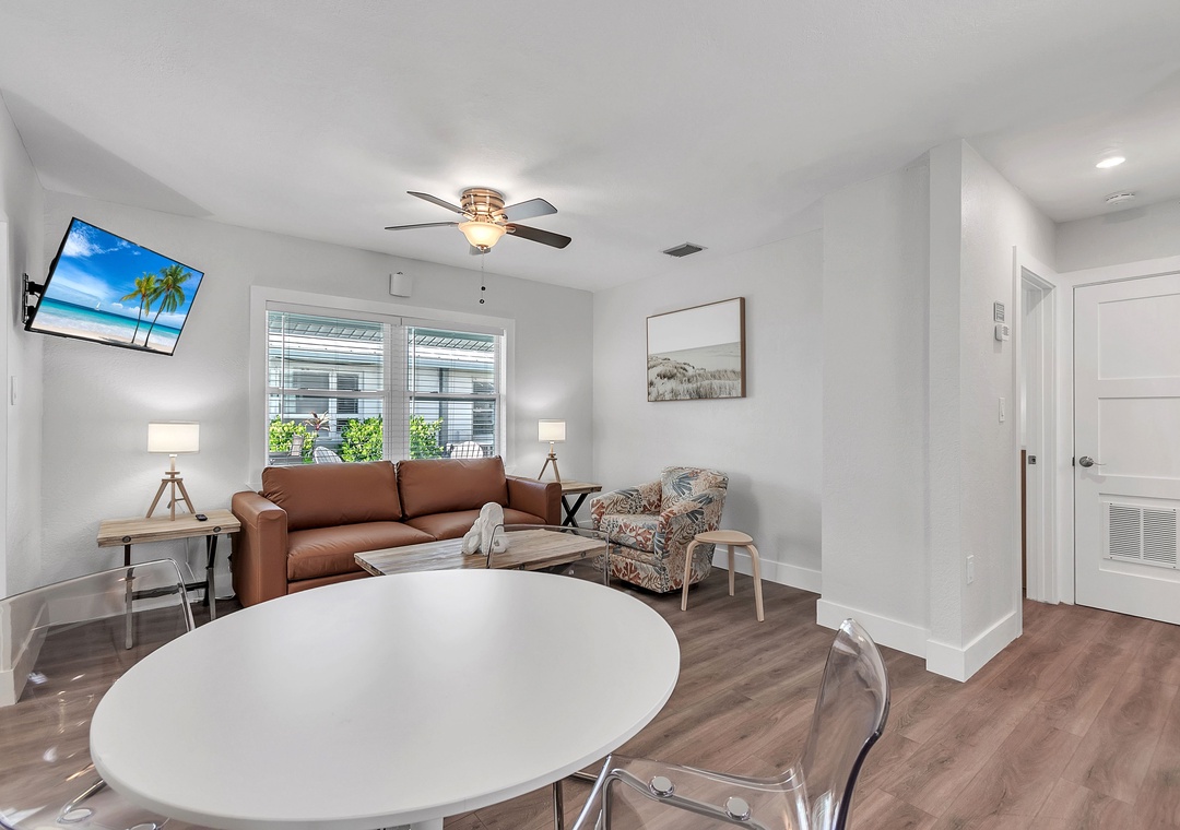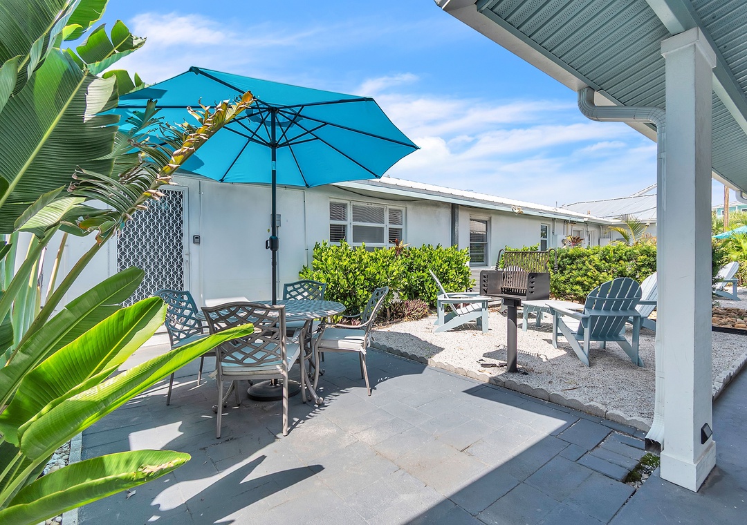 Just outside your front door, enjoy a shared outdoor space with table and chairs along with a charcoal grill—great for evening BBQs. The Bungalows also feature a large pool deck with lounge chairs and umbrellas, heated pool and another shared common area with charcoal grills, more seating, and outdoor games like cornhole and Connect 4. Additional amenities include a coin-operated laundry room onsite, free Wi-Fi, and one assigned parking space. And don't forget Fido! Dogs are welcome here, fees and restrictions apply.