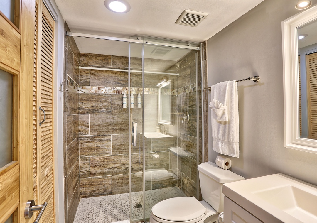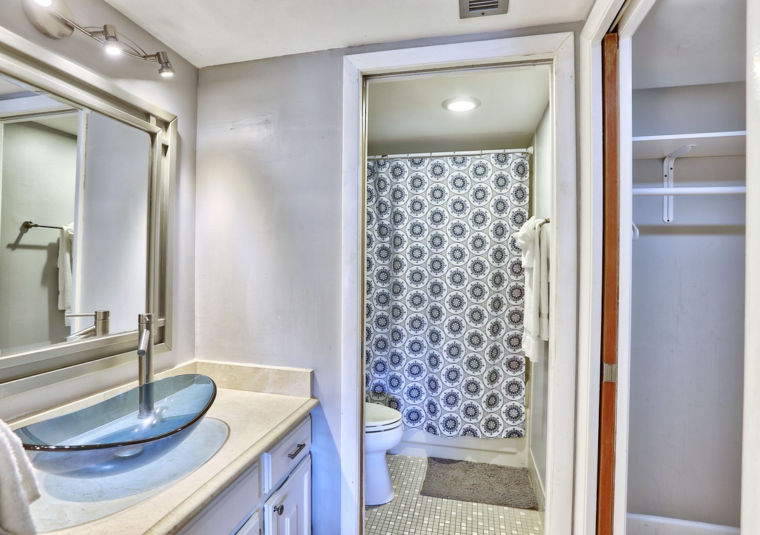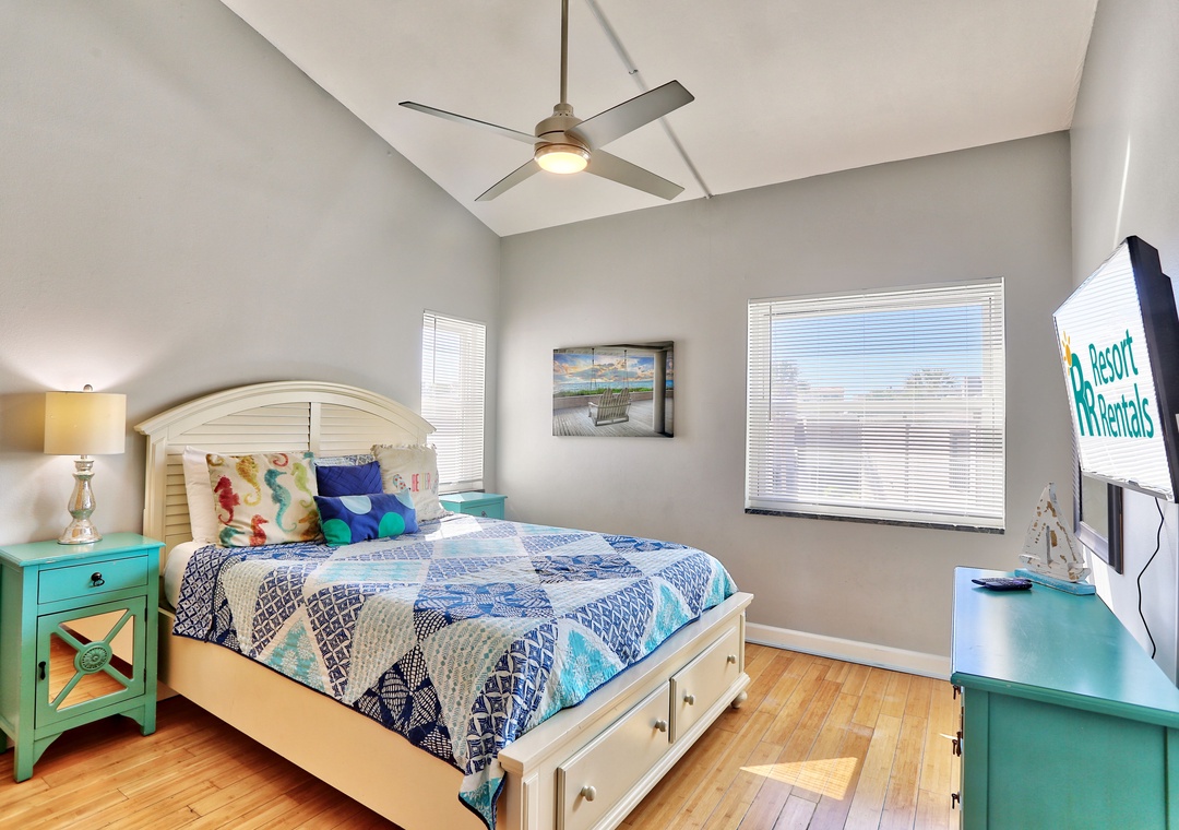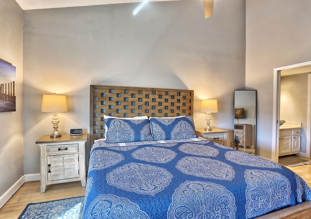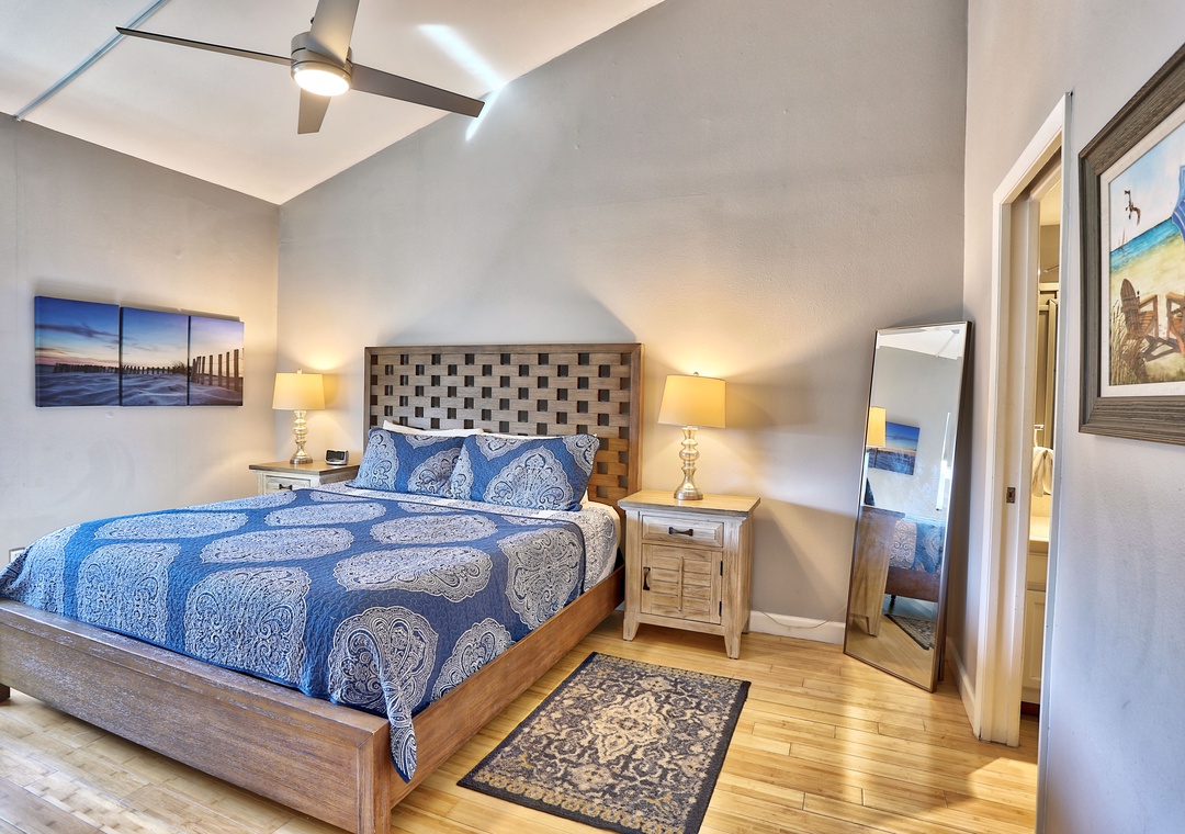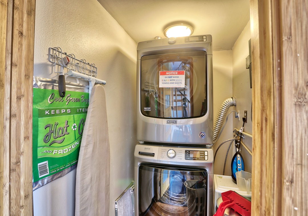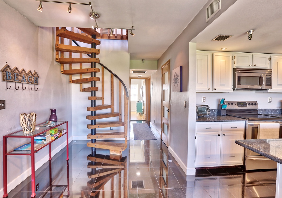 The master bedroom provides a roomy and cozy retreat with a king bed, TV, and attached bathroom. The second bedroom, also on the main level, features a queen bed and TV. Upstairs, accessible via a charming spiral wooden staircase, the loft serves as the third bedroom with a full-size bed and a twin-over-twin trundle—perfect for additional guests or kids. The updated guest bathroom showcases beautiful tile work and a large walk-in shower. For added convenience, the condo includes a washer and dryer, free WiFi, and two assigned parking spaces located under the building. **Please note that there is no elevator, and stairs are required for access.