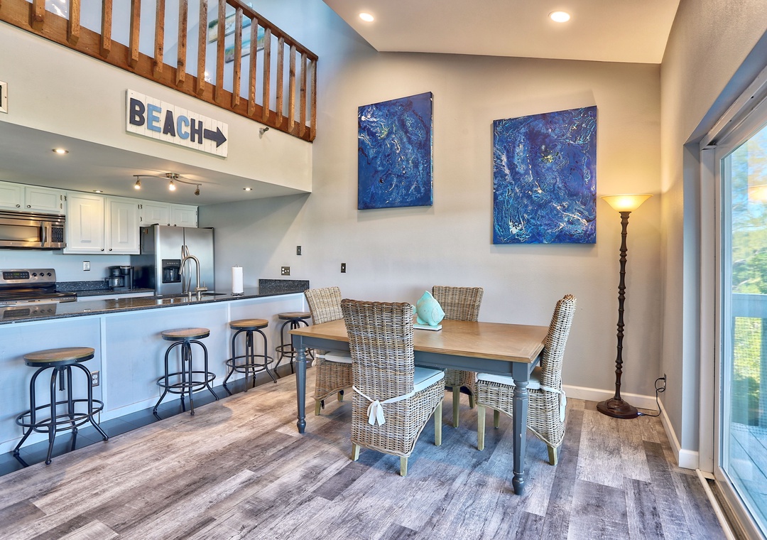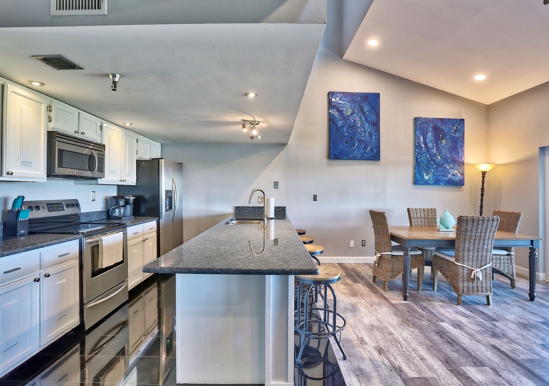 The open living area is perfect for gathering, featuring two comfortable couches, a loveseat, and a large wall-mounted TV. The living room flows seamlessly into the dining and kitchen areas, where you’ll find a large dining table ideal for meals or game nights. The spacious kitchen offers plenty of counter space, additional seating at the counter, and is fully stocked with appliances (no dishwasher), dishware, cookware, and utensils—everything you need to prepare delicious meals. Step out to the private balcony off the living and dining area, complete with a table, chairs, and a swinging bench. Here, you can relax while enjoying views of the mangroves and Intracoastal, listening to local wildlife, and watching boats—or even dolphins—pass by.