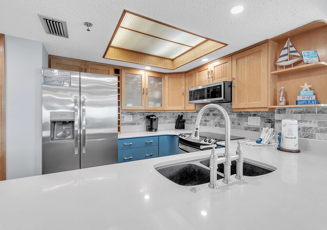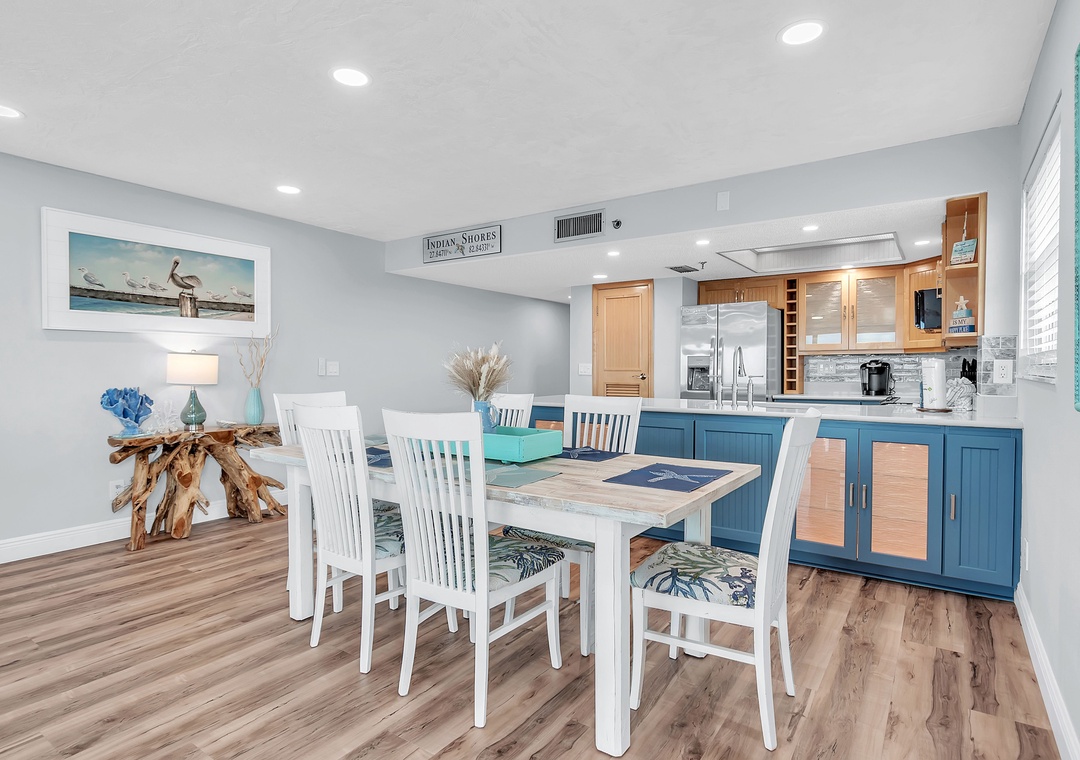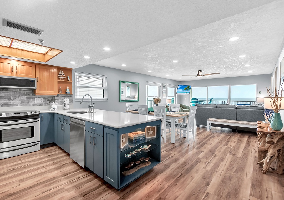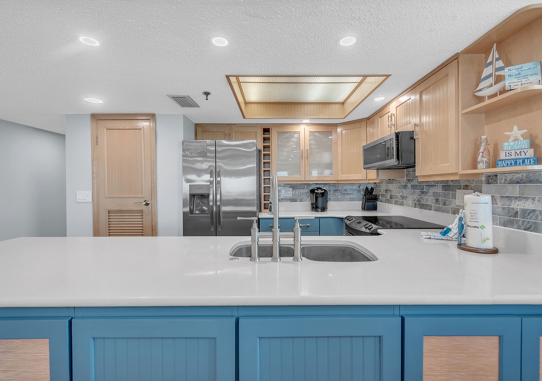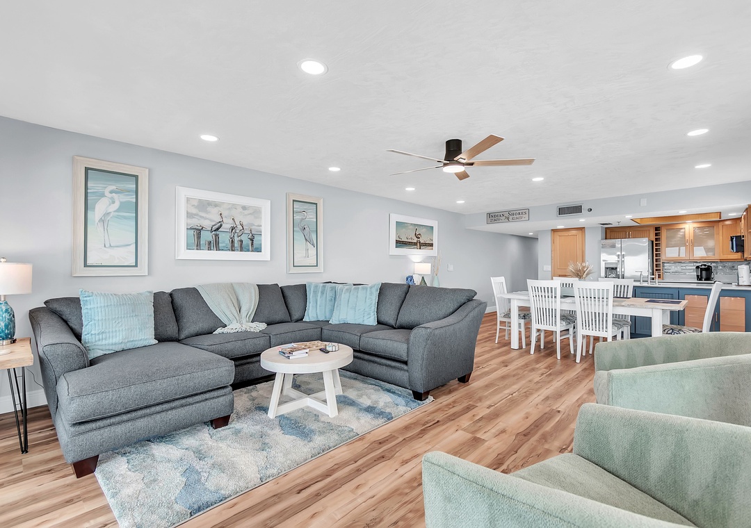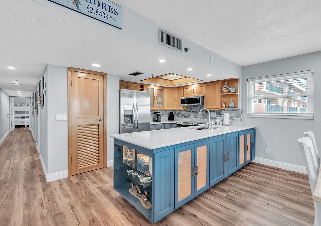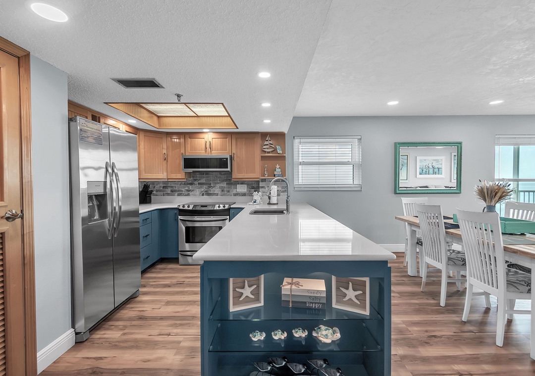 Step into a spacious, coastal-inspired living area featuring an oversized, comfy sectional, two sitting chairs, and a large flat-screen TV—perfect for relaxing after a day at the beach. The living room opens directly onto your private balcony, complete with outdoor seating and a dining set, ideal for sunset dinners or morning coffee with Gulf breezes. The fully equipped kitchen is a cook’s dream, boasting updated stainless steel appliances, ample counter space, and everything you need to whip up meals, from cookware to utensils. Dine indoors at the large dining table—great for meals or a night of board games with the family.