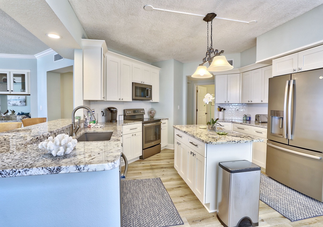 The master bedroom features a king-sized bed, a private bathroom, and balcony access with breathtaking Gulf views. The other three bedrooms also offer comfortable accommodations with king and queen beds. Step into the beautifully updated, elegant kitchen equipped with stainless steel appliances, granite countertops, and a breakfast bar. The spacious living room provides ample seating for the whole family and offers balcony access with expansive views of the sunset each evening. Gather around the large dining room table, comfortably seating 6 guests, for memorable meals together. For your convenience, there's a private washer and dryer in the unit.