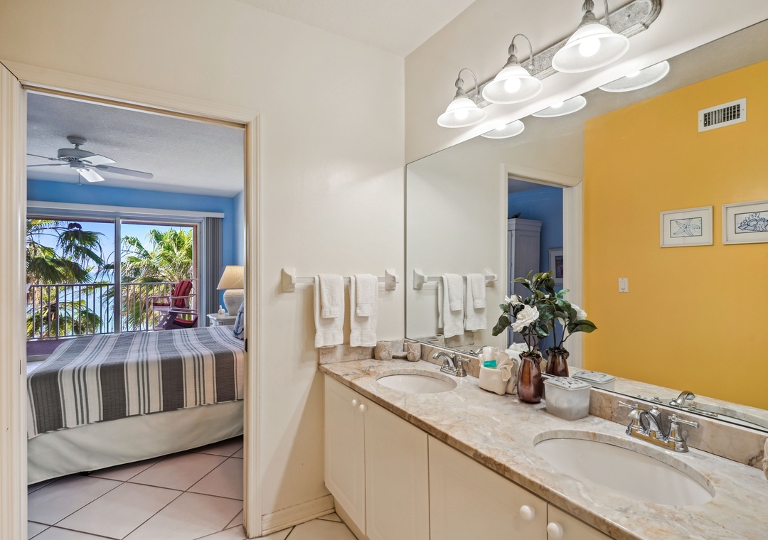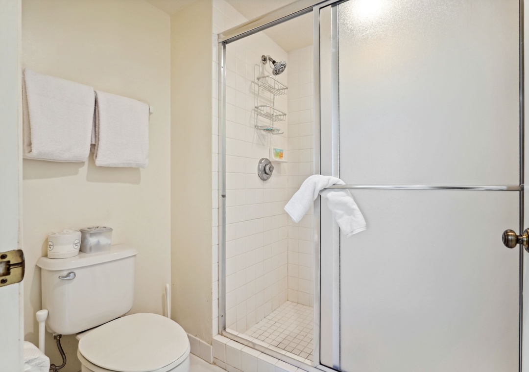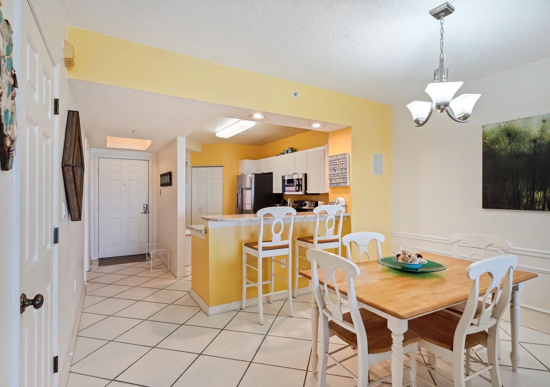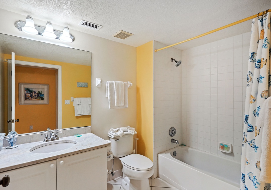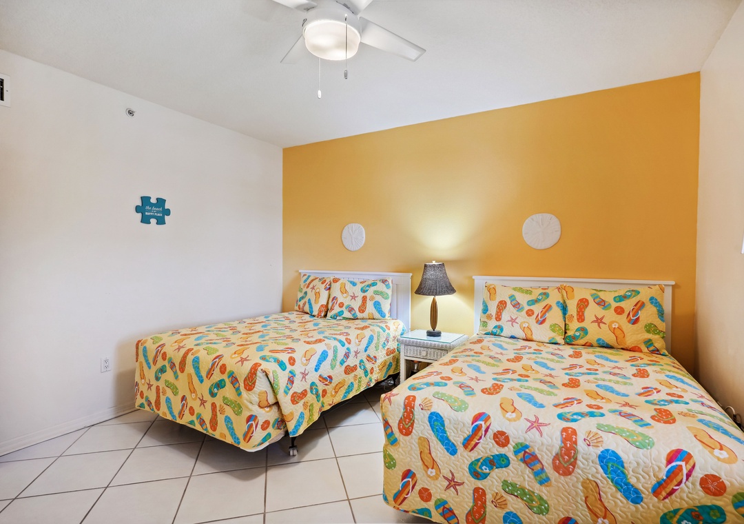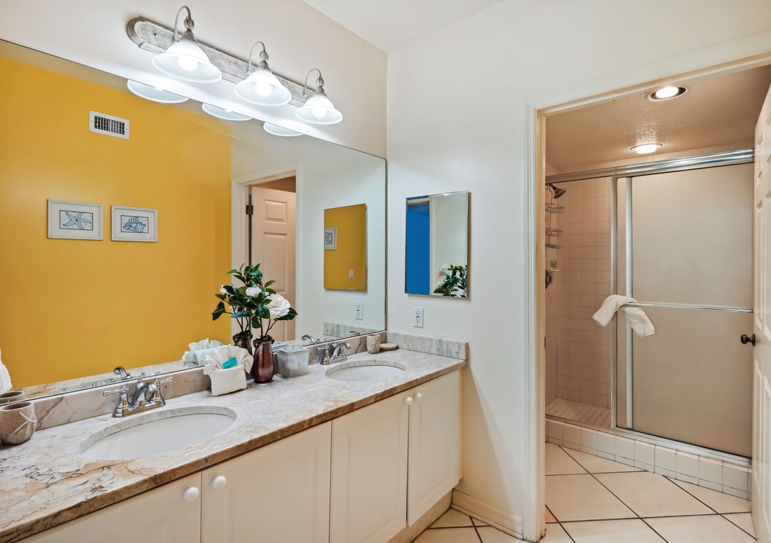 In the primary bedroom, you'll find a cozy king-sized bed. The primary bath includes a spacious double vanity and a walk-in shower. Off the hallway, a guest bedroom is offered with two double beds. There is a second full bathroom which includes a tub/shower combination. A washer/dryer is also located in the condo for guest use.
