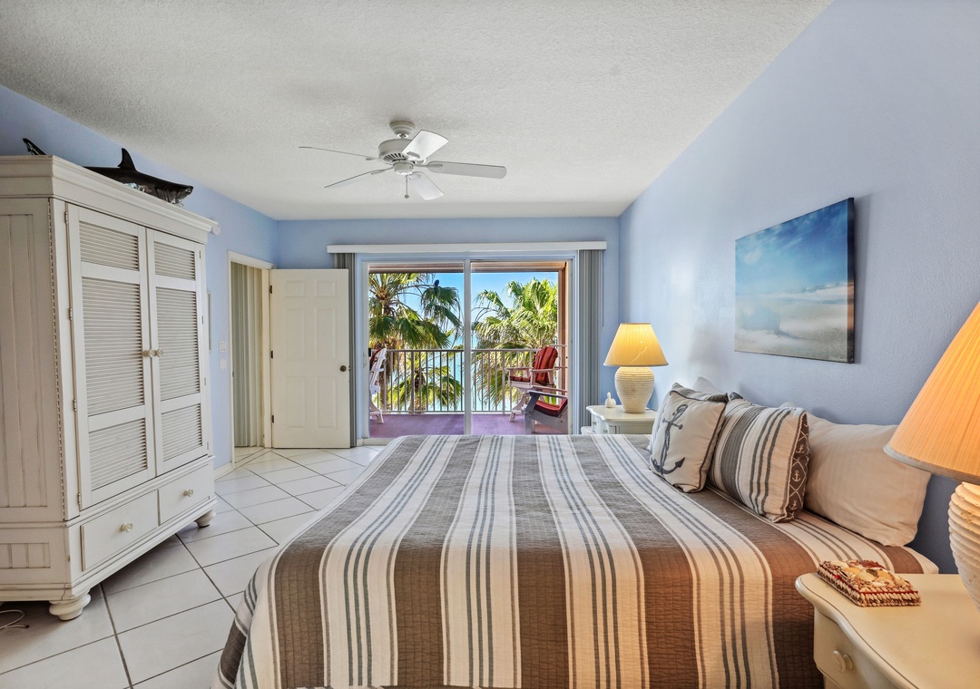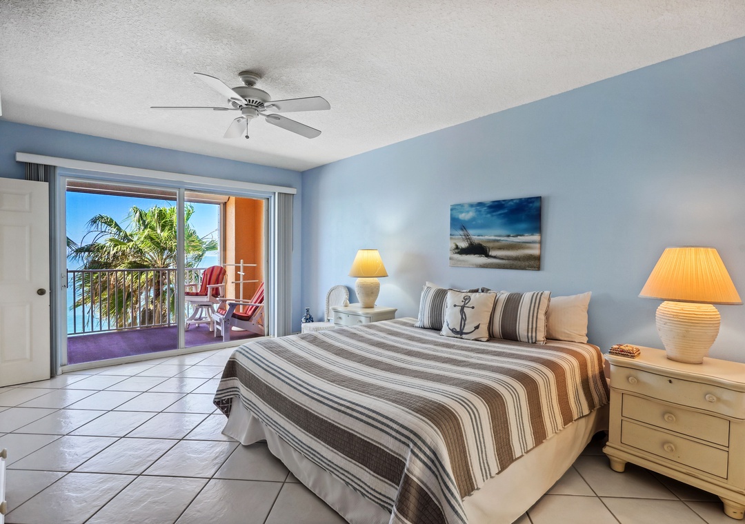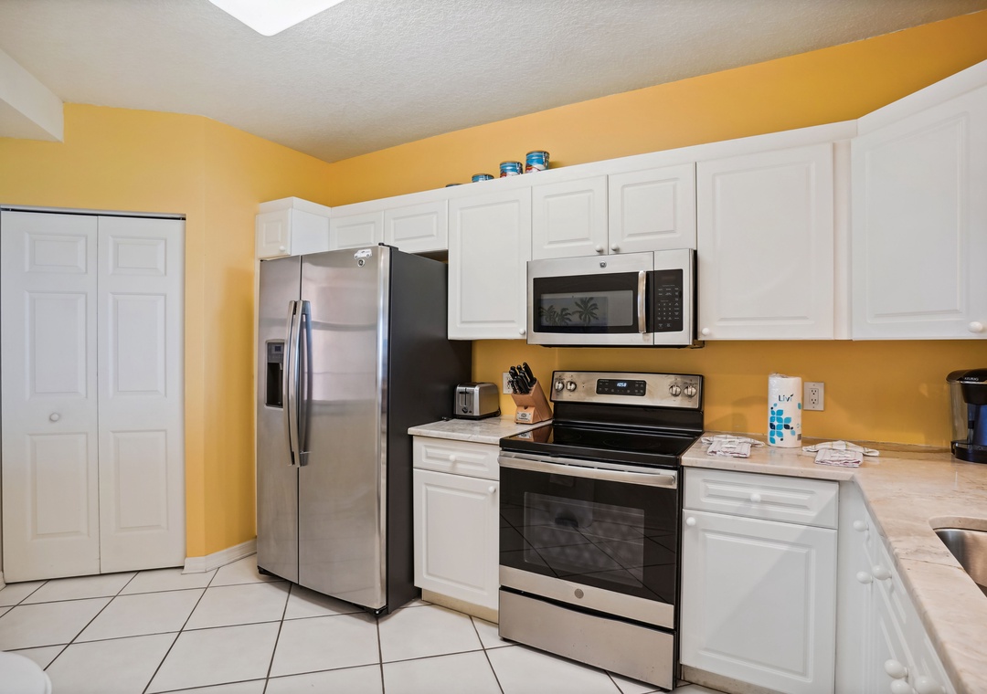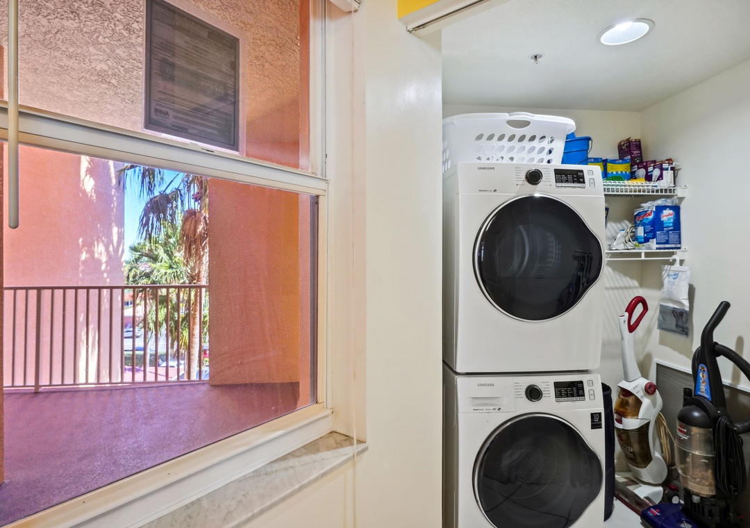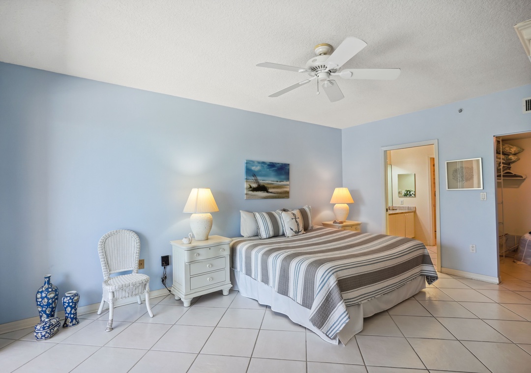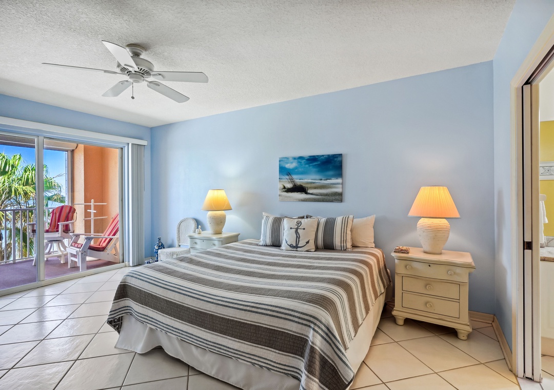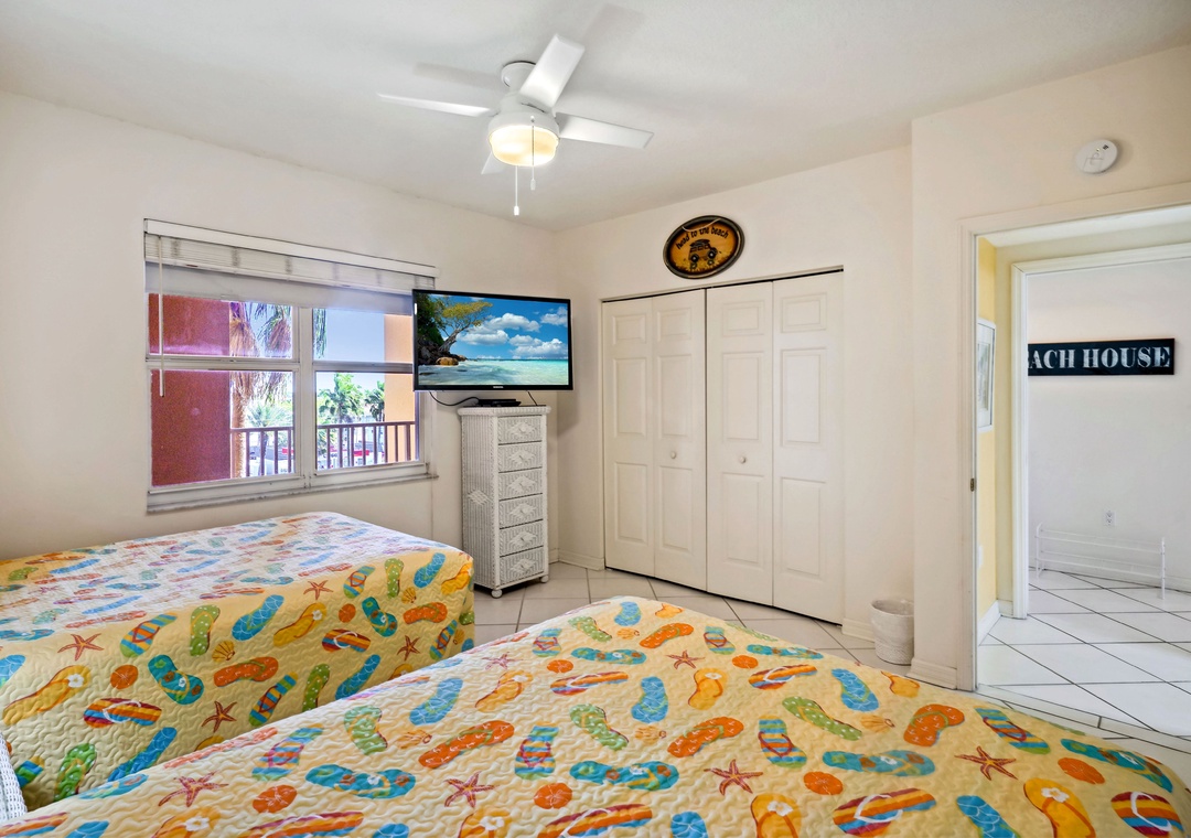In the primary bedroom, you'll find a cozy king-sized bed. The primary bath includes a spacious double vanity and a walk-in shower. Off the hallway, a guest bedroom is offered with two double beds. There is a second full bathroom which includes a tub/shower combination. A washer/dryer is also located in the condo for guest use.