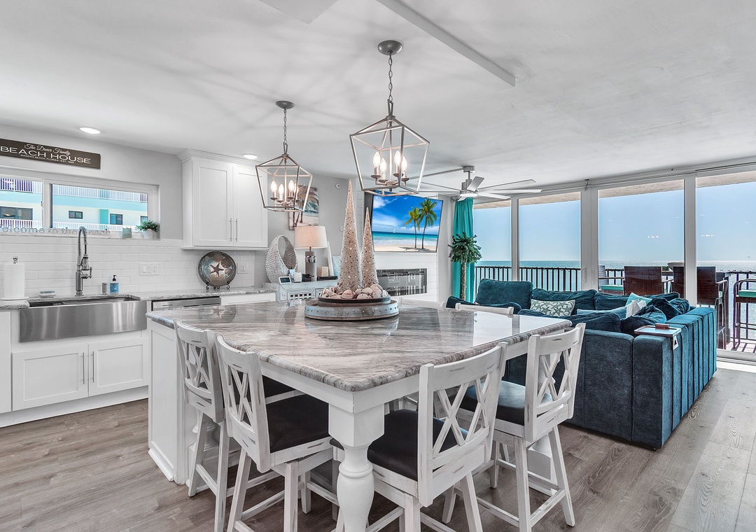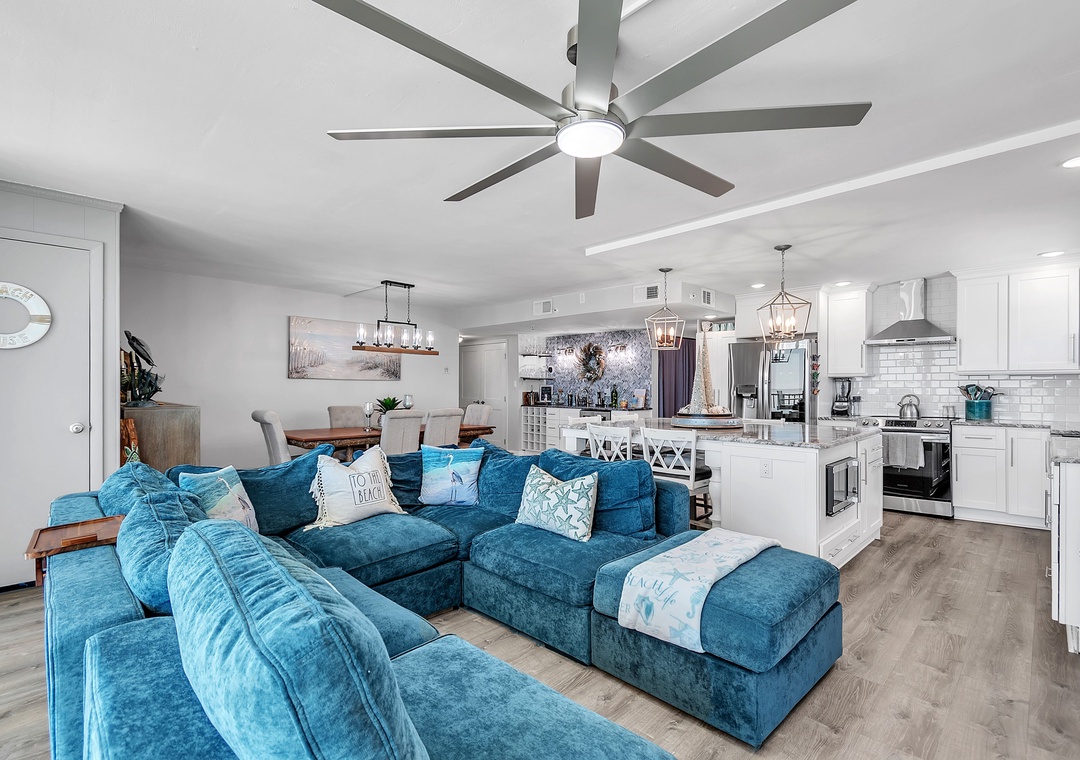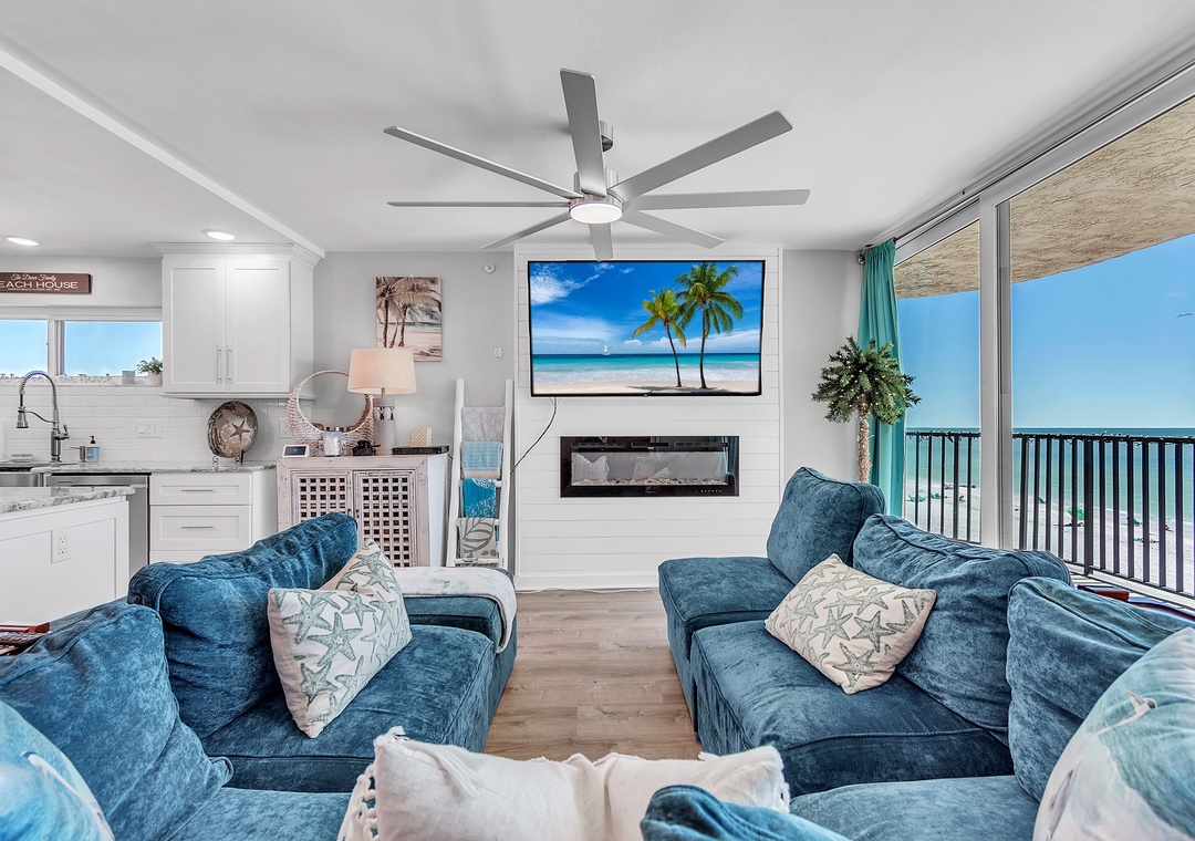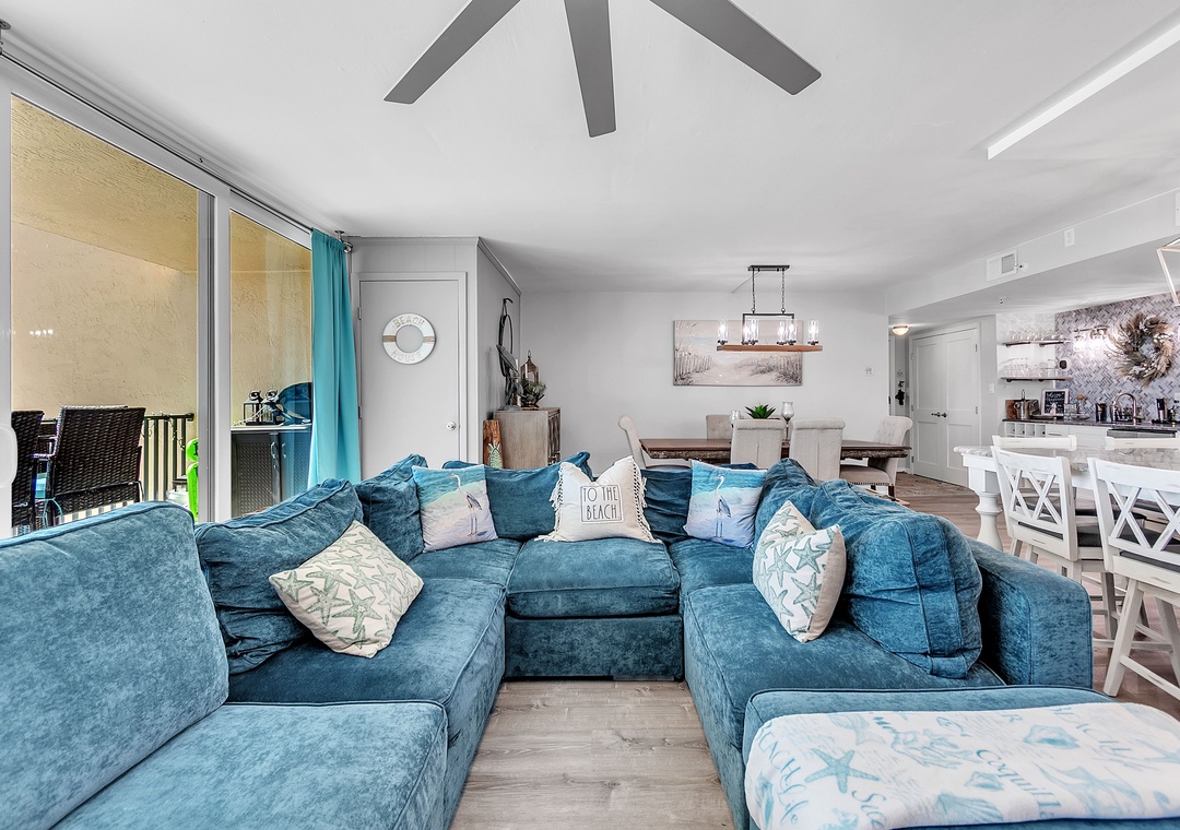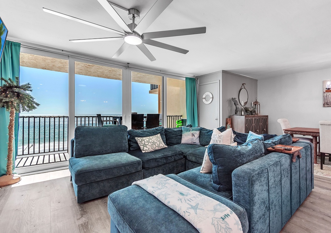 This bright and spacious retreat features an open-concept living area with an oversized, ultra-comfy sectional — perfect for relaxing with the whole family after a sun-soaked beach day. Enjoy movie nights on the large Smart TV or step out onto the private beachfront balcony for an unforgettable sunset view.