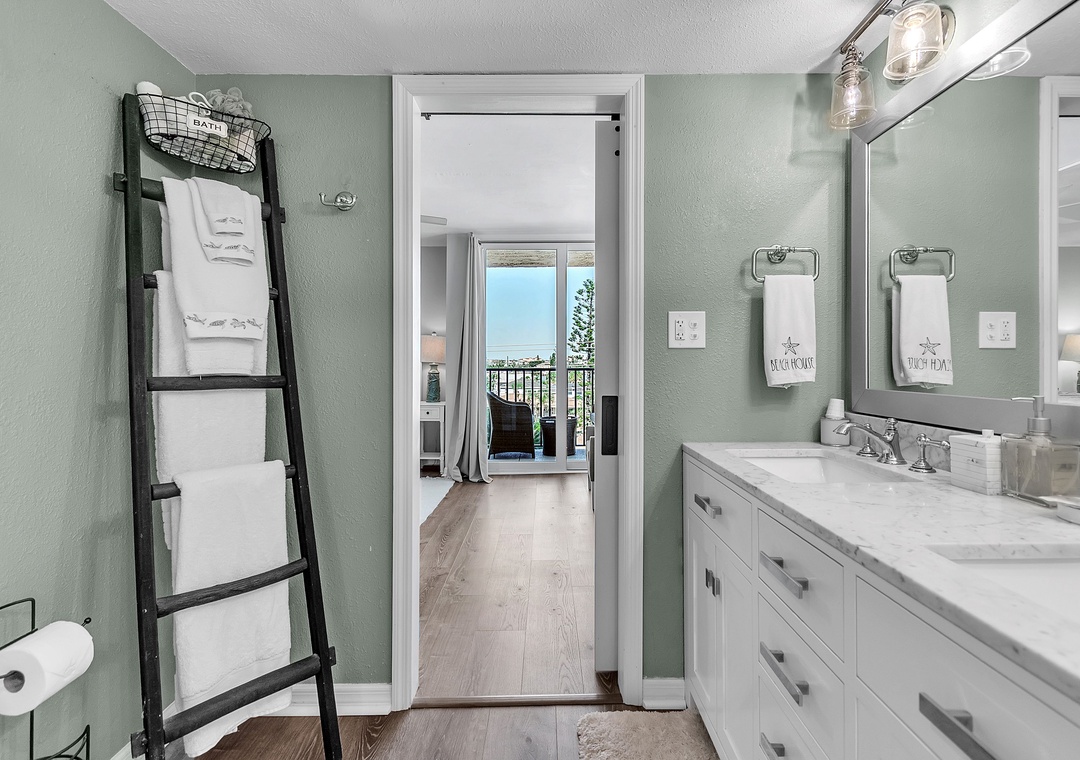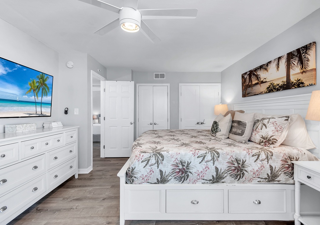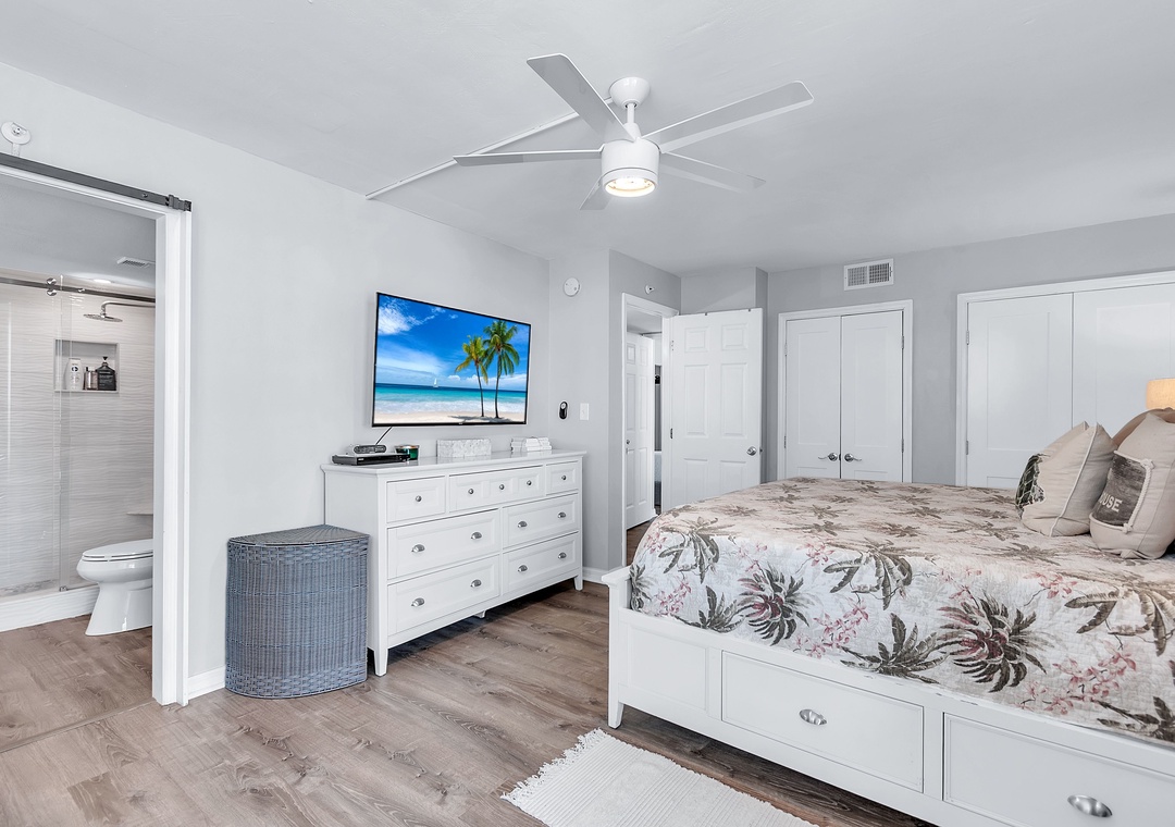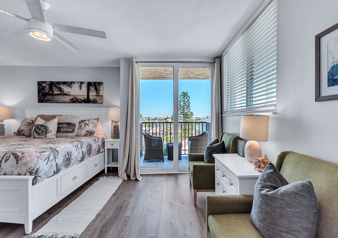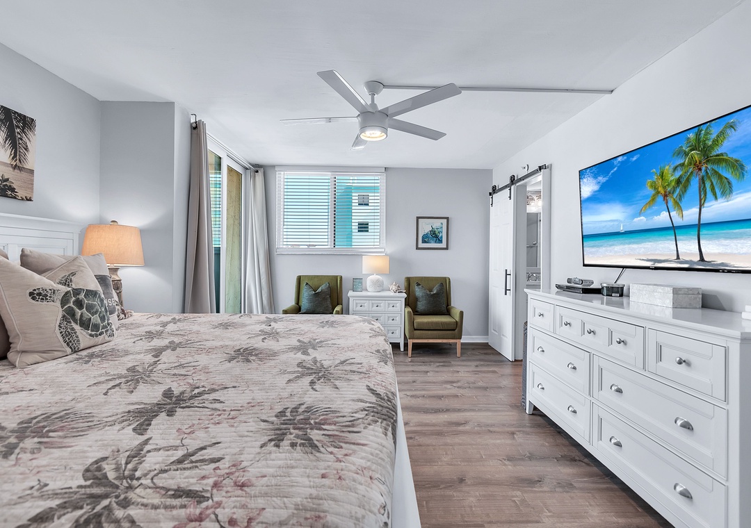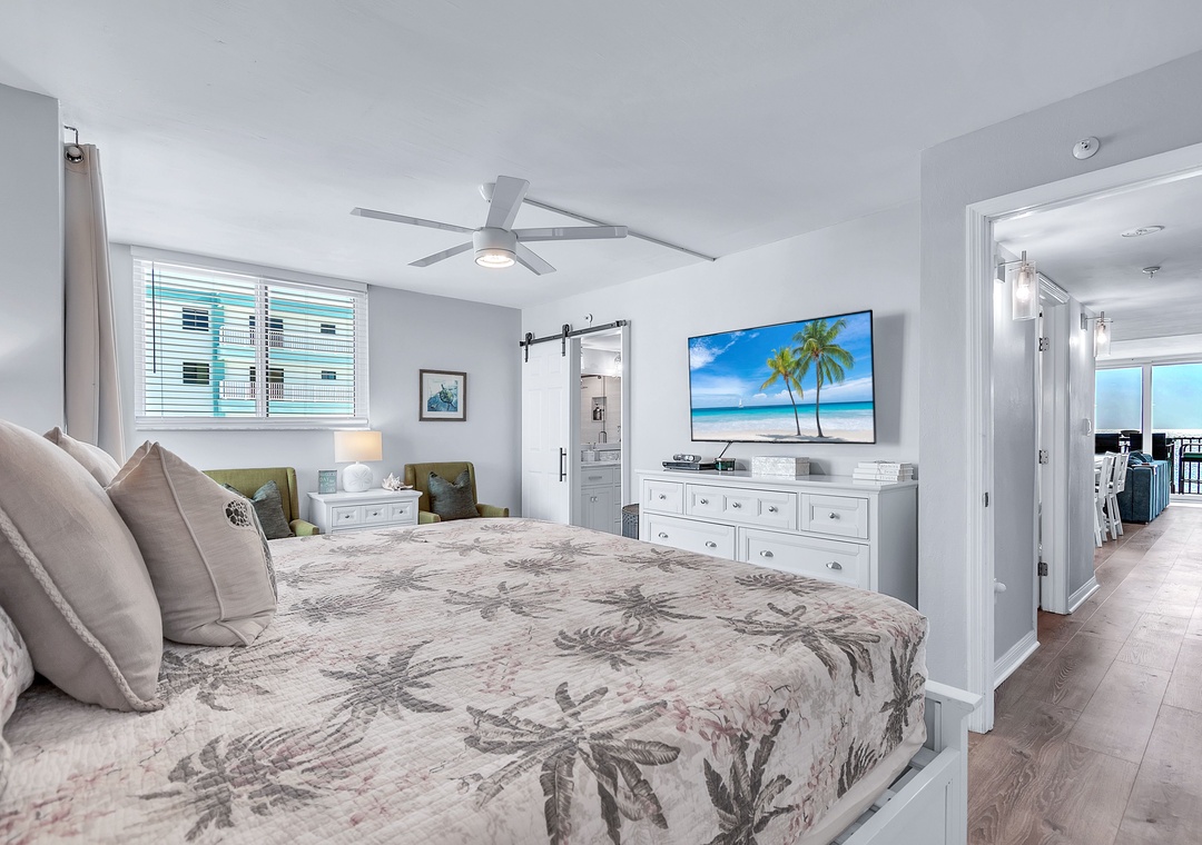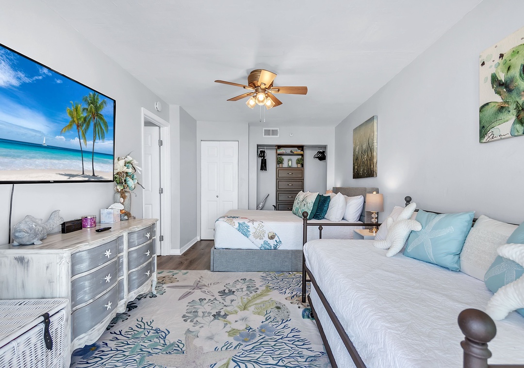 The spacious master bedroom boasts a luxurious king-size bed, Smart TV, en suite bathroom, and a private balcony overlooking charming Gulf Blvd and the city of Madeira Beach. The guest bedroom is perfect for families or friends, offering a queen bed, a twin daybed with a pull-out twin trundle, Smart TV, and access to the beachfront balcony.