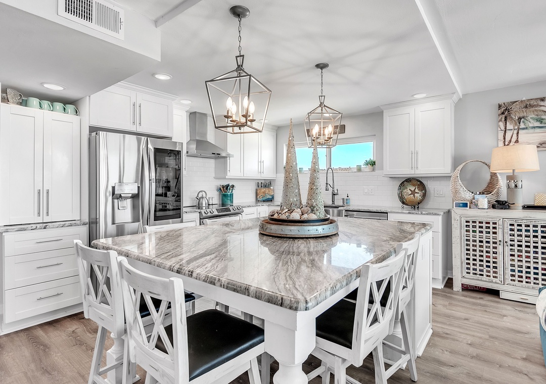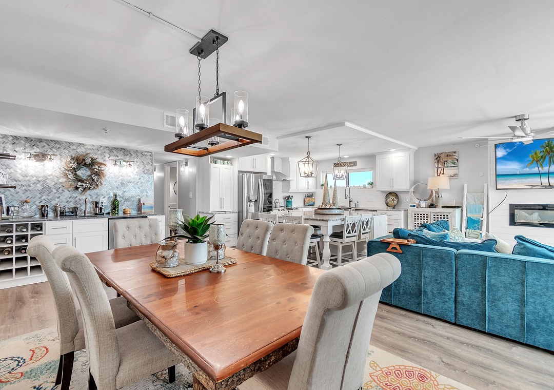 The kitchen is a chef’s dream, featuring updated stainless steel appliances, gorgeous granite countertops, a stunning backsplash, and a large island with extra seating — ideal for morning coffee or a post-dinner card game. The kitchen flows seamlessly into the dining area, where a table for six offers space for family meals or a fun family puzzle! A built-in bar area with a wine cooler adds a touch of elegance to your evening wind-down.