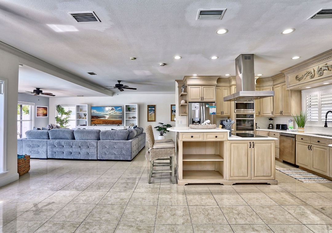 The heart of the home has an expansive living area, where you'll find an oversized couch and chair perfect for unwinding after a day of adventures. The living room opens up to a deck, seamlessly blending indoor and outdoor living. Love to cook? This home boasts a stunning, newly updated kitchen with top-of-the-line appliances and is fully stocked for all your cooking needs. The adjacent dining table, along with extra seating in the kitchen, provides plenty of space for family meals.