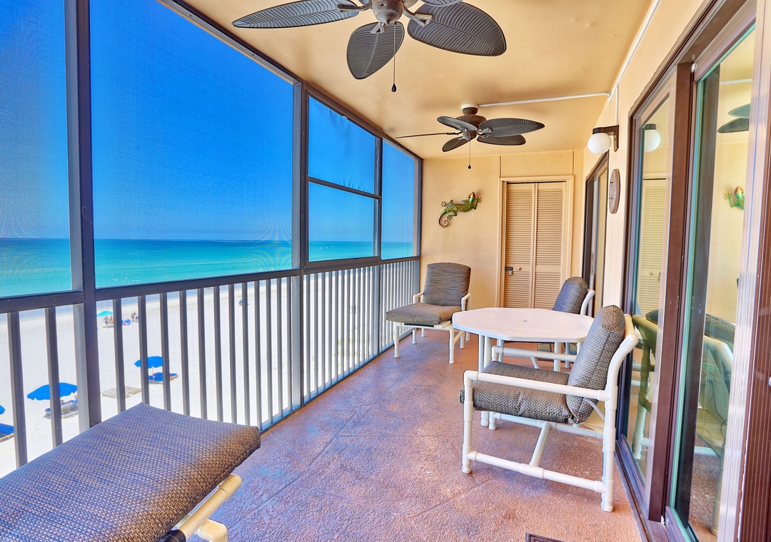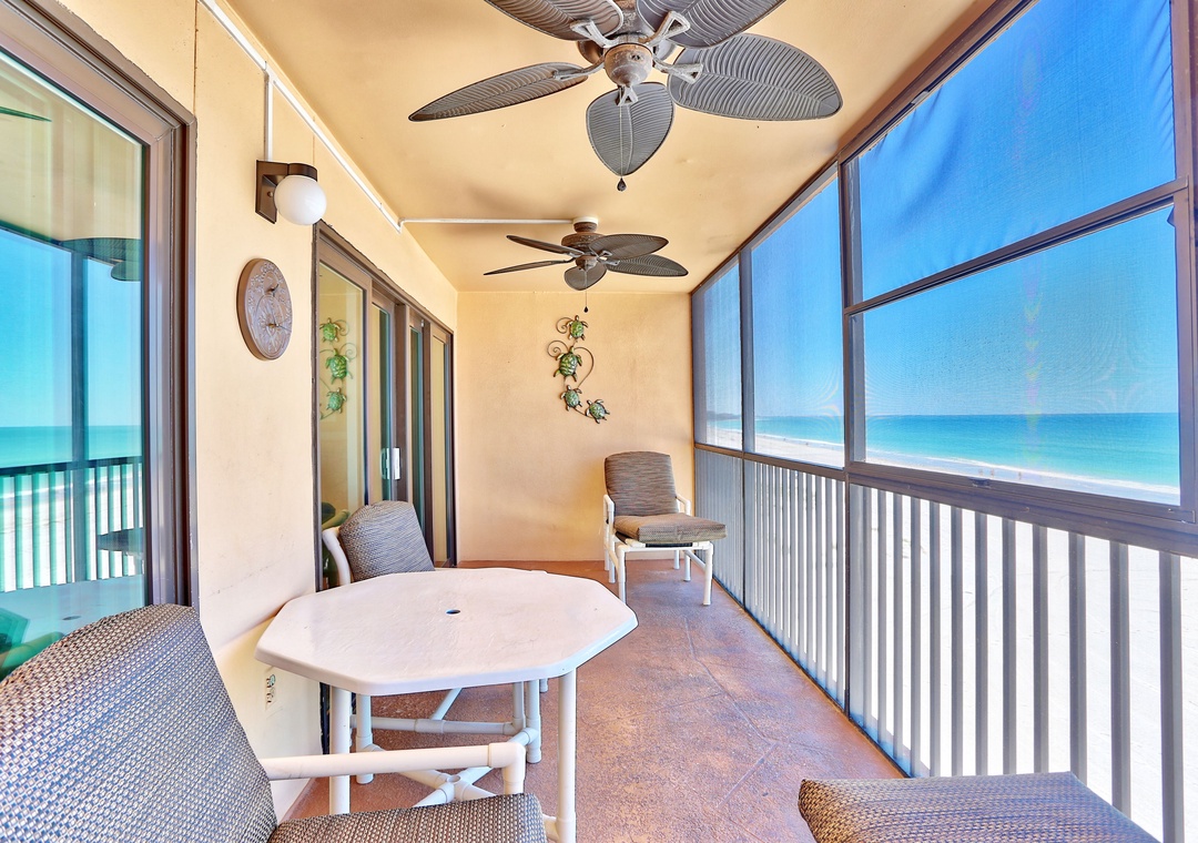 • Spacious screened balcony featuring breathtaking views of the Gulf of Mexico.