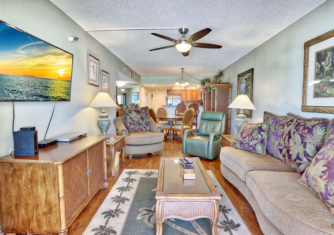 Comfortable, over-stuffed wicker furniture welcome you to this beach front condo. The view of the beach and the Gulf of Mexico from the large screened in balcony is super! Plus, the master bedroom has a door to the balcony as well. The kitchen has been renovated and is fully equipped. The small den can be used as a 3rd bedroom. This is a perfect place to relax and enjoy the Florida lifestyle and you are within walking distance to restaurants, shops and other beach activities. Flat screen televisions and Wireless Internet Included. PLEASE NOTE: This is a non-smoking property with the exception of a designated outside smoking area.
