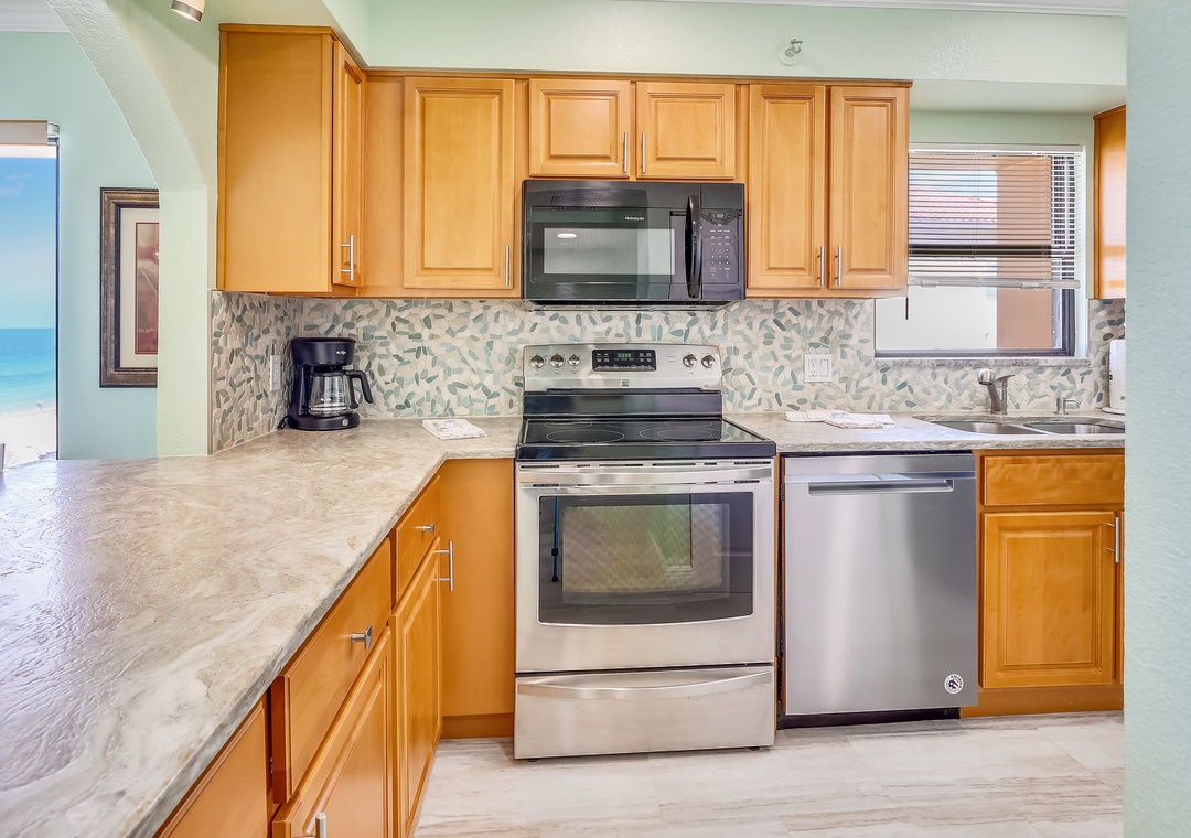 This totally remodeled condo is a large north corner condo that has a screened in balcony facing the beach and the Gulf of Mexico. You have access from both the living area as well as the master bedroom to your balcony. The kitchen has been updated and is fully equipped; relax on your private balcony with a cup of coffee from your Keurig coffee maker You are within walking distance to restaurants, shops and other beach activities. Your condo has a washer and dryer as well as free internet service. PLEASE NOTE: This is a non-smoking property with the exception of a designated outside smoking area.