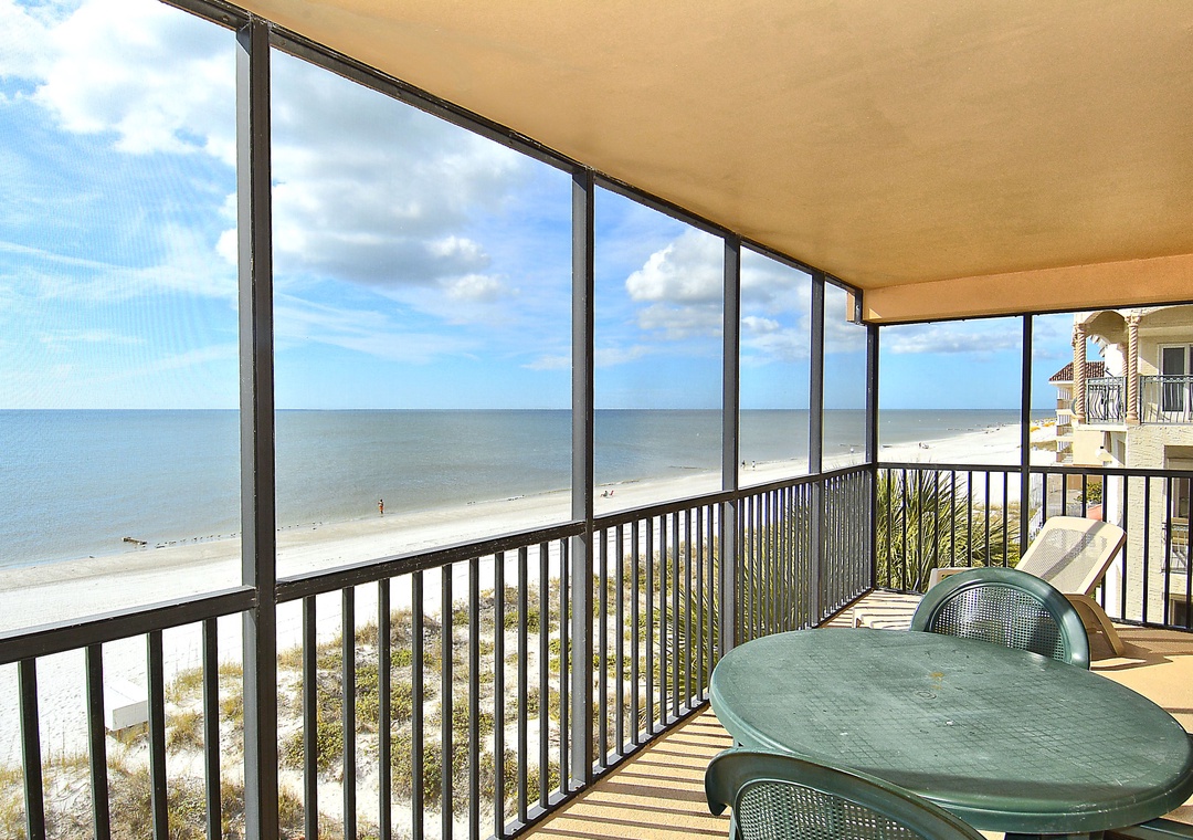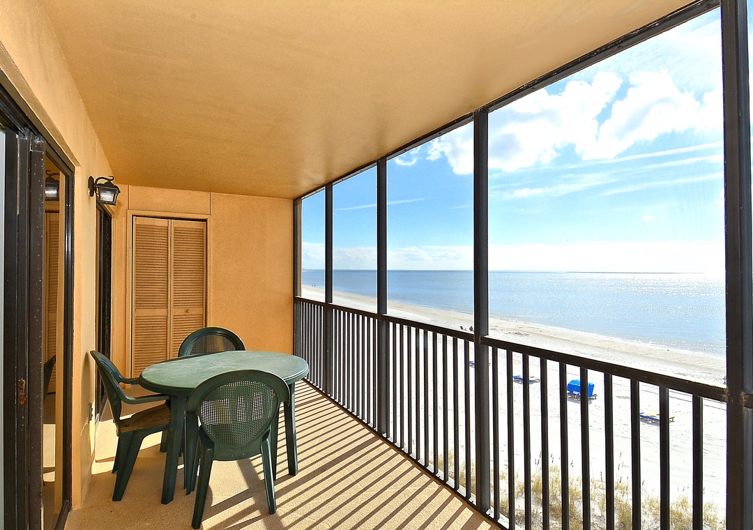 • Spacious screened balcony featuring breathtaking views of the Gulf of Mexico.