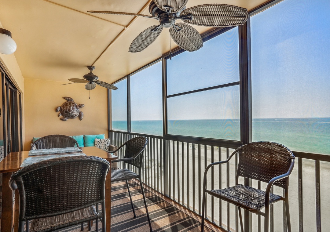 • Spacious screened balcony featuring breathtaking views of the Gulf of Mexico.