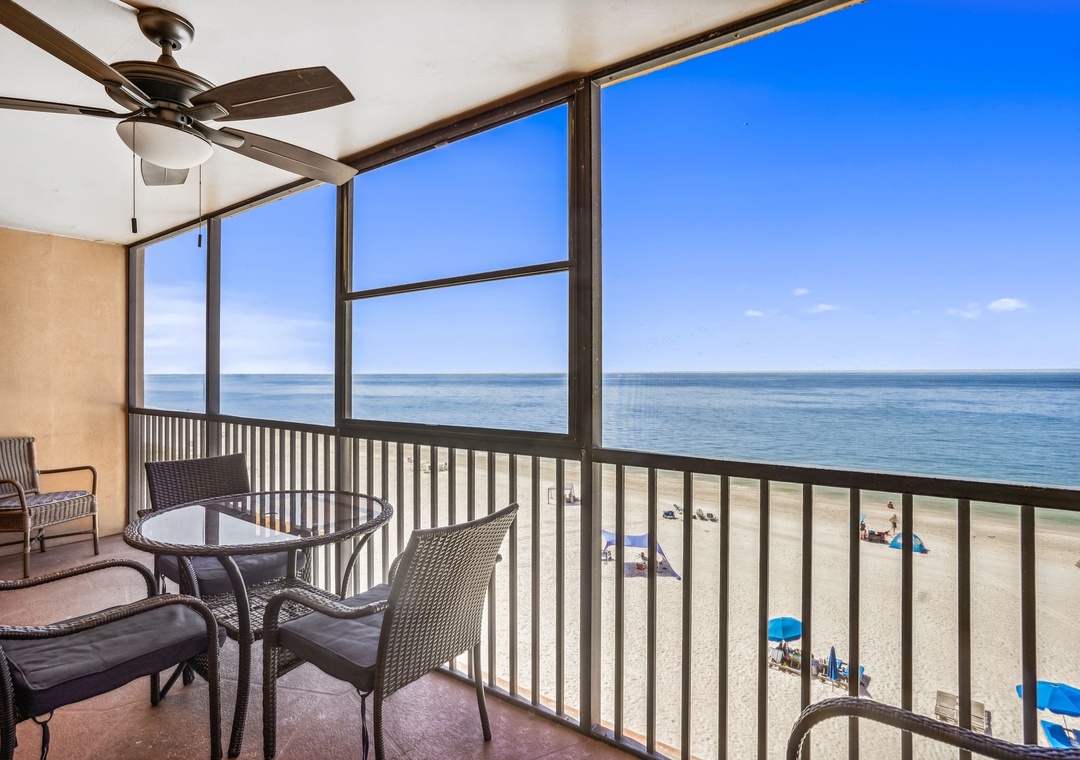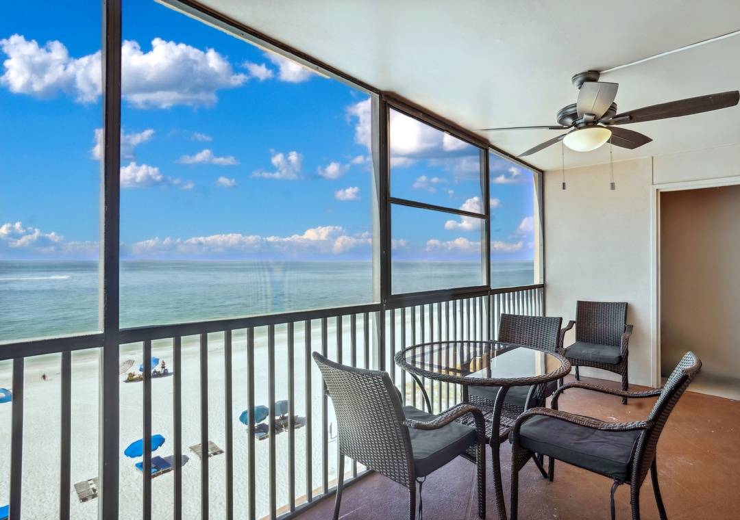 • Spacious screened balcony featuring breathtaking views of the Gulf of Mexico.
