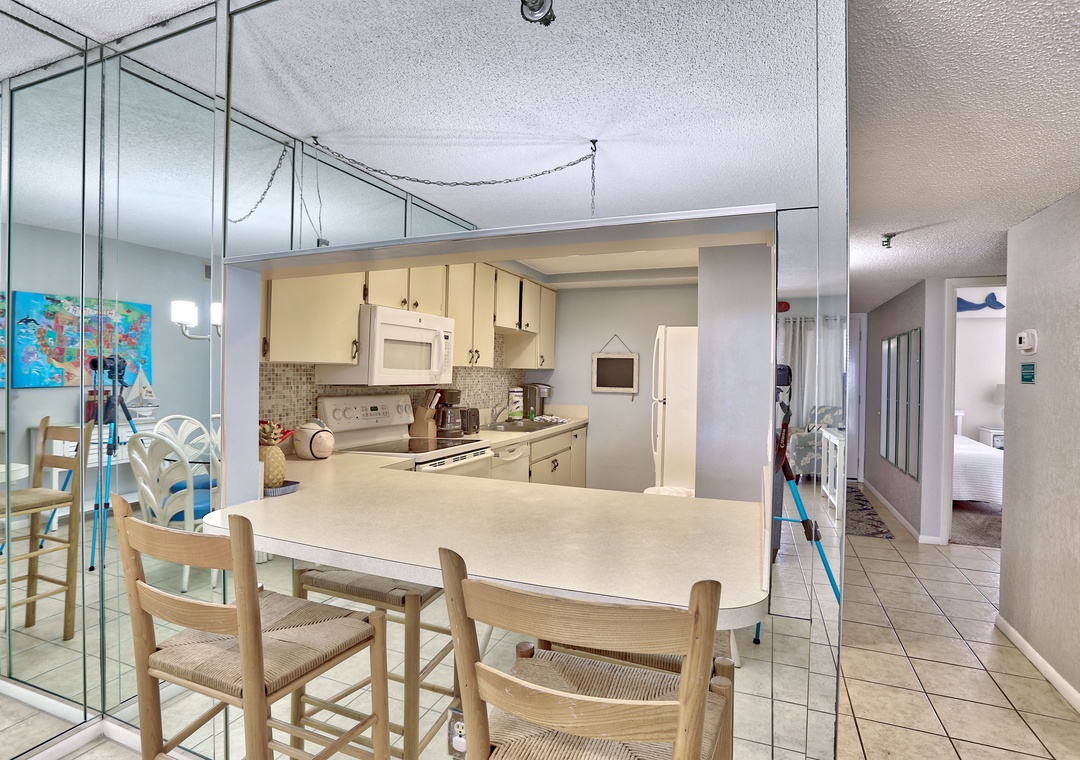 The positive is the view, the porch, and the pool! And for our family that made this trip work. However, the check in is ridiculous. Driving over 20 minutes out of your way to pick up and drop off the keys is ridiculous. Also, I knew the unit was dated. That never really bothers me. But the couch and love seat were just plain dirty and heavily stained. I ended up using sheets in the hall closet to cover the furniture so we could sit on them. Finally, I understand you don’t stock units with paper products, cleaning products and/or basic food supplies…. But not one solitary item was provided. Not even a sponge. No salt. Or ANY pantry item. Our grocery bill was ridiculously high. We have food allergies so cooking in is not something we can avoid! The host fees and service fees are always very high in my opinion. And I can not help to question what these services provide if not the very concerns I have listed.- Reviewed On: 3/6/2024