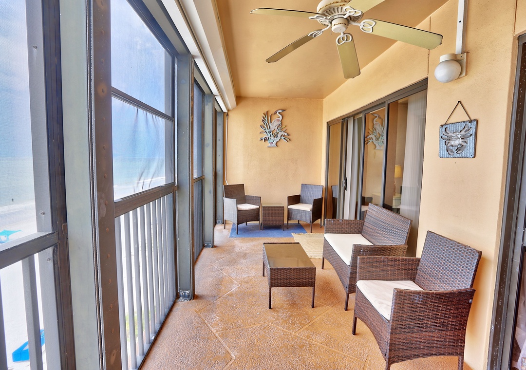 • Spacious screened balcony featuring breathtaking views of the Gulf of Mexico.