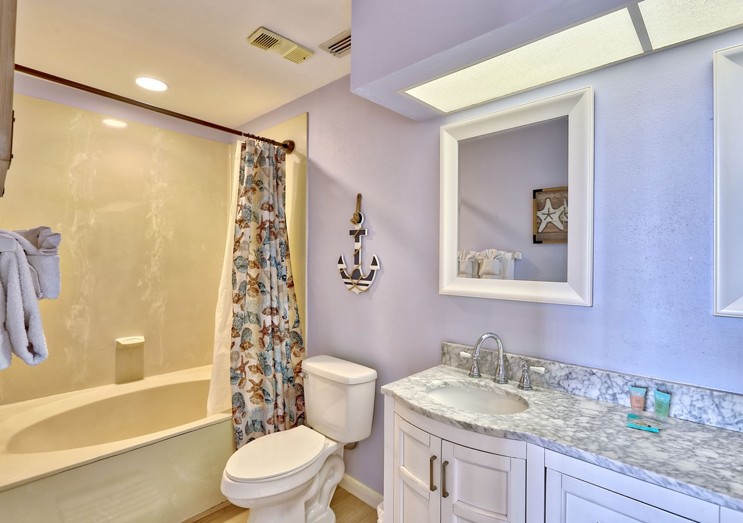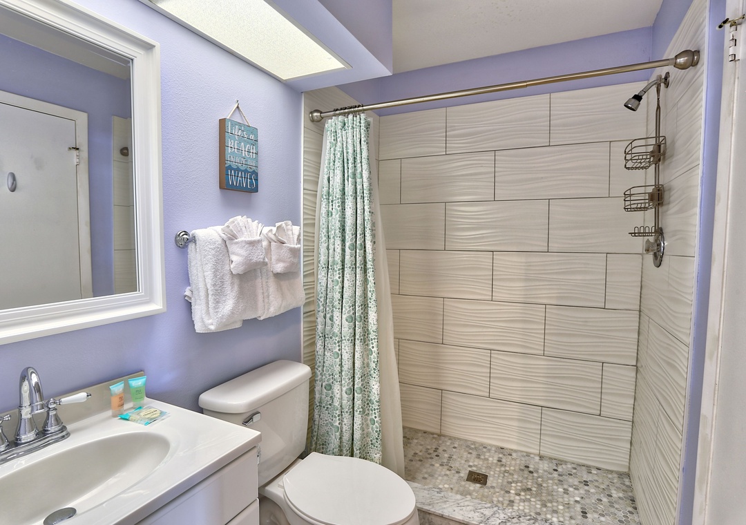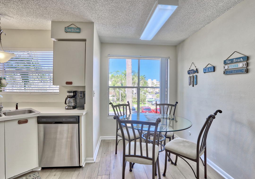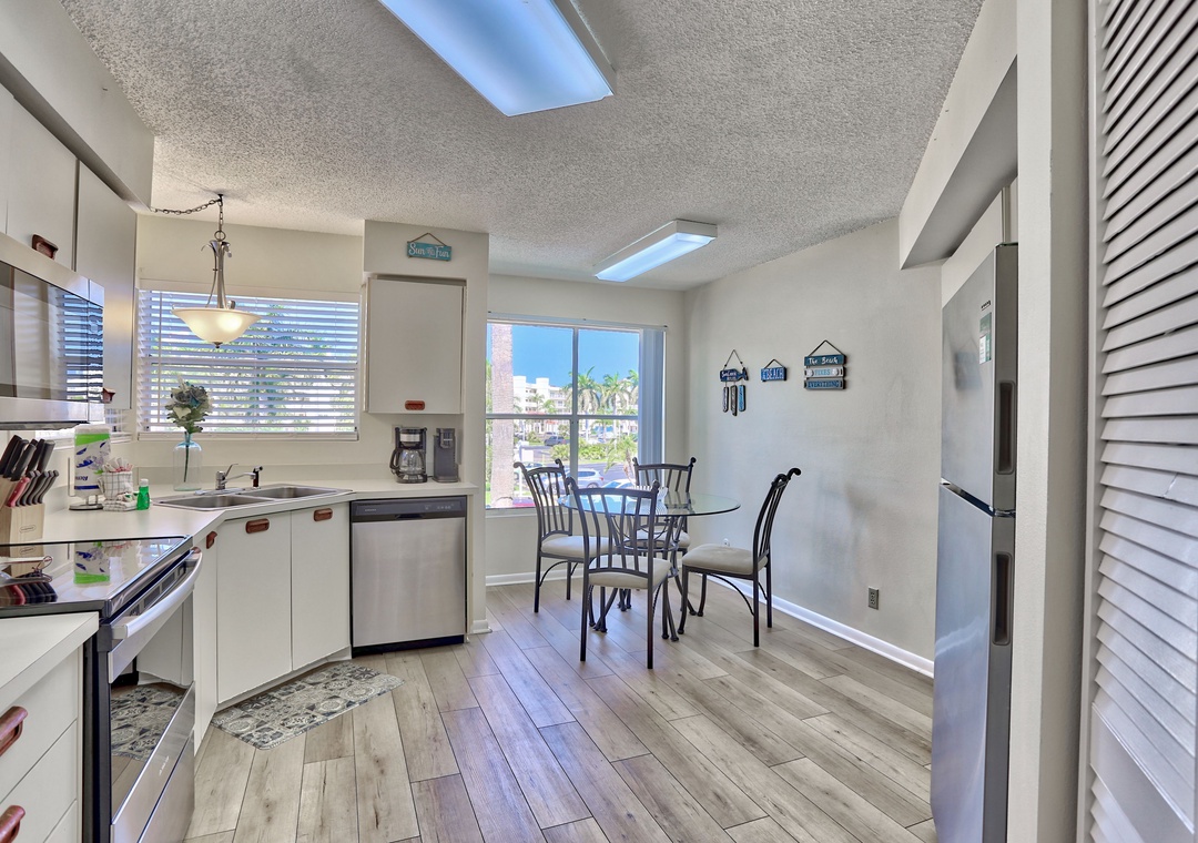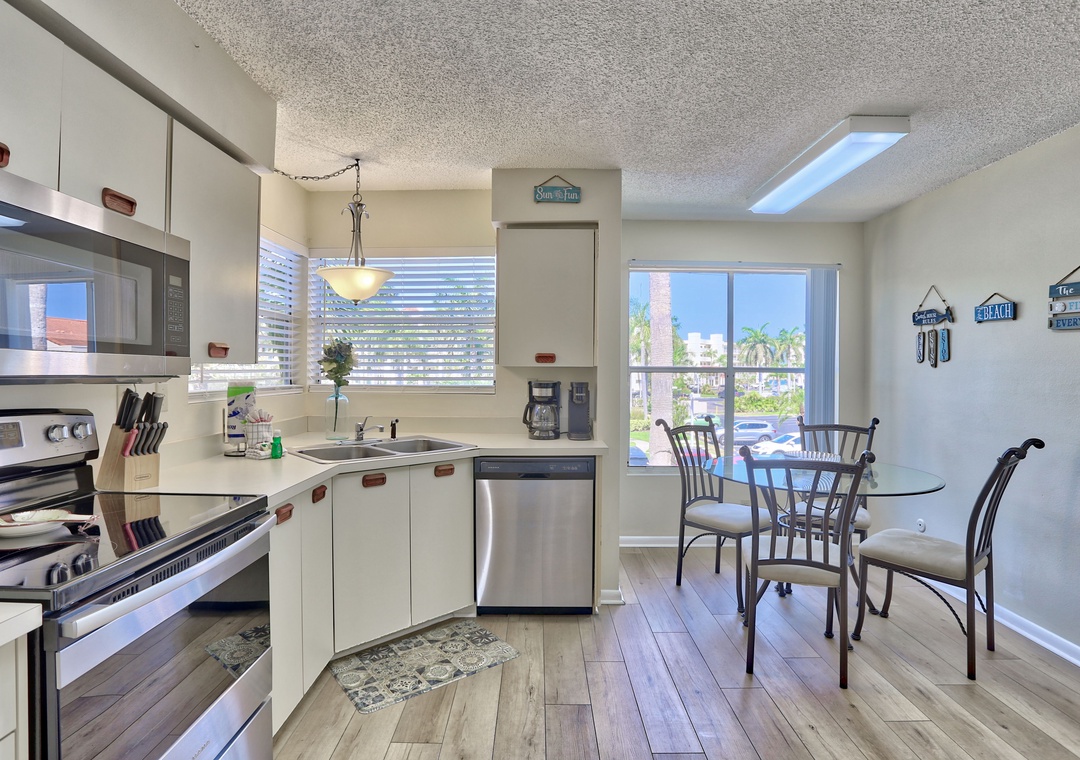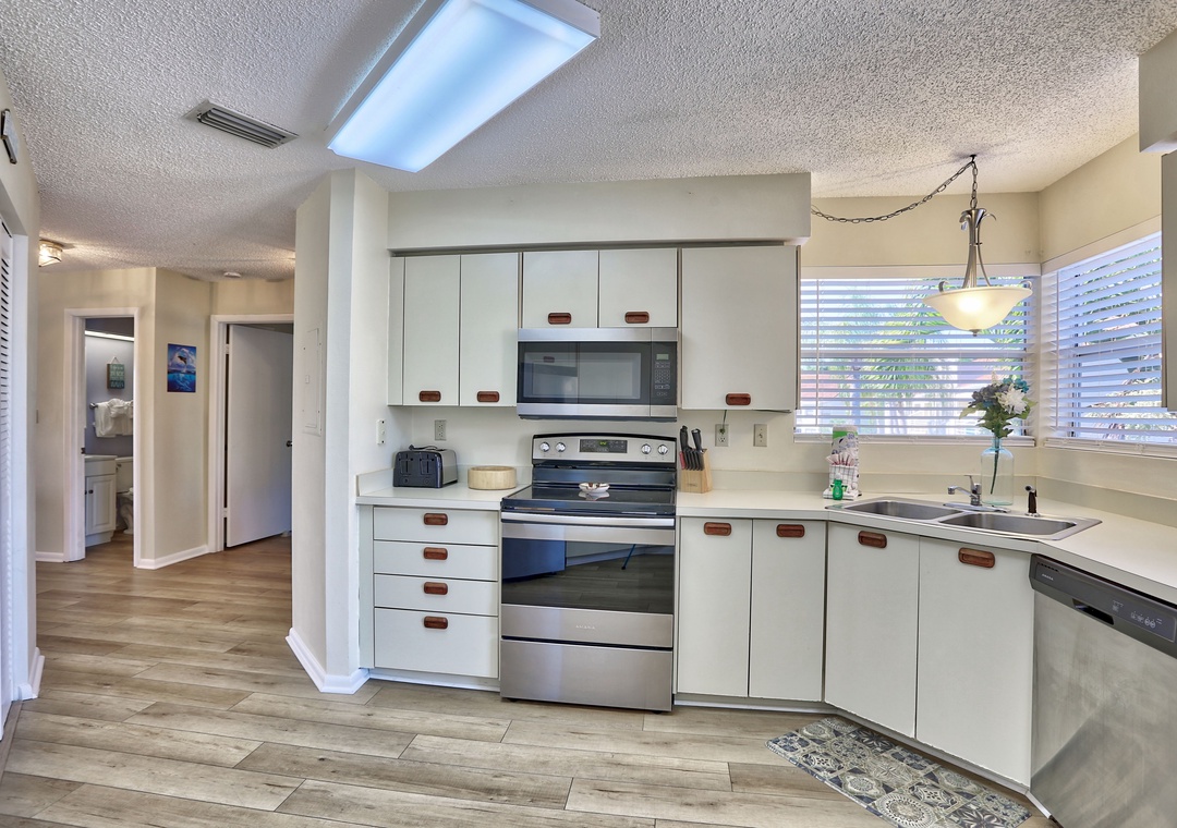 The beautifully updated kitchen is fully equipped with everything you need to prepare delicious meals during your stay.