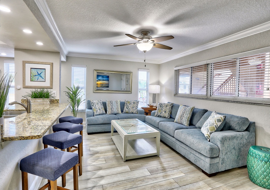 We needed a quick getaway from Alaska to visit sunny beaches and warm waters. Our vacation split time between Treasure Island and Anna Maria Island. Our time on the former, and specifically with this property, was the better experience. Upon opening the front door, we found the interior to be as expected from the advertising photos. The unit was spacious enough for a 1 BR, 1 BA housing a family of four. Leaving the sleeper sofa open doesn't leave you feeling cramped in the living room. The bedroom was large enough to fit a king bed plus room to move around. Two separate entries into the bathroom allows for parents to close the bedroom door but also access the bathroom without worrying about exposure. Kids can access the bathroom at night without having to come into the bedroom. Great setup. The kitchen is well appointed and has stone countertops. With limited space, this is crucial as it allowed me to utilize those surface areas with a hot pan without worrying or wasting time looking for a hot pad. I did not have the same luxury at the place on AMI which reinforced how important these little details are. Outside, the property is nice with the waterway to the east (you can fish from the dock), a pool and several outdoor facets/showers to rise your feet. There is an elevator but we didn't use it. A flight of stairs from the covered parking and you're essentially right at your door. Oh, about that covered parking -- it was really nice having a covered spot to shield the rental vehicle from baking in the sun. Another small detail but you'll begin to see how all these little details matter! The beach is a stone's throw away. We Google Mapped the place prior to arrival to understand what to expect but you can literally have your feet in the sand within three minutes of leaving the front door! Walk down the western staircase, exit to the street, head a few paces north and you'll reach a crosswalk. Press the button, traffic stops, you cross and enter a parking lot with beach access. It's really that simple. This property is in a fantastic location so you don't have to worry about driving to the beach and fighting for a parking spot. There are also a couple of coolers in the unit and beach chairs in the outdoor locker in front of the parking space. Restaurants, a grocery store and shopping are all within walking distance. More shopping and restaurants are a short drive north to John's Pass. We'd rent this property again in a heartbeat.- Posted: 6/29/2021