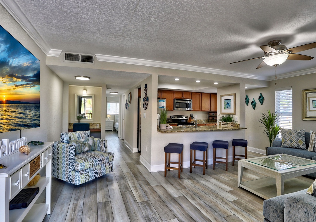 This spacious one-bedroom condo has been completely updated with a combination of beautiful hardwood and tile flooring. The fully equipped kitchen features granite counter tops, stainless steel appliances and is fully equipped for all you need to prepare a delicious meal. A spacious living room is open to the kitchen to provide a perfect atmosphere for socializing. The bedroom features a king bed and lots of natural light. The living room also includes a sleeper sofa to allow up to 4 guests to sleep comfortably. For added convenience you will also find free WiFi, assigned parking and a washer/dryer in the condo. Unwind at the waterfront pool and imagine yourself on vacation just a little while longer.